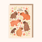 Discover this adorable Capybara themed birthday card! Perfect for lovers of wildlife and nature everywhere, this unique illustrated greetings card features several capybaras with the playful caption "capy birthday!".