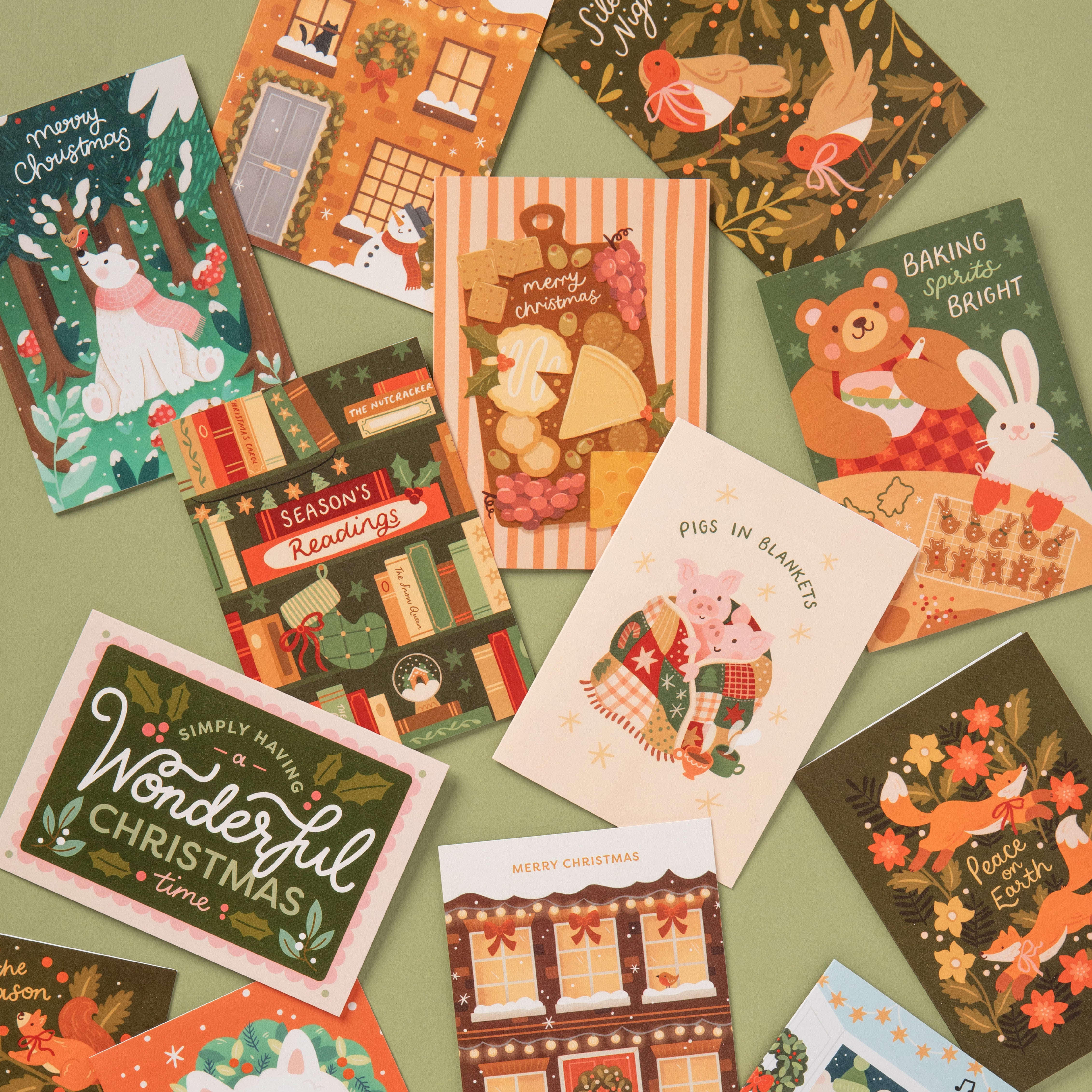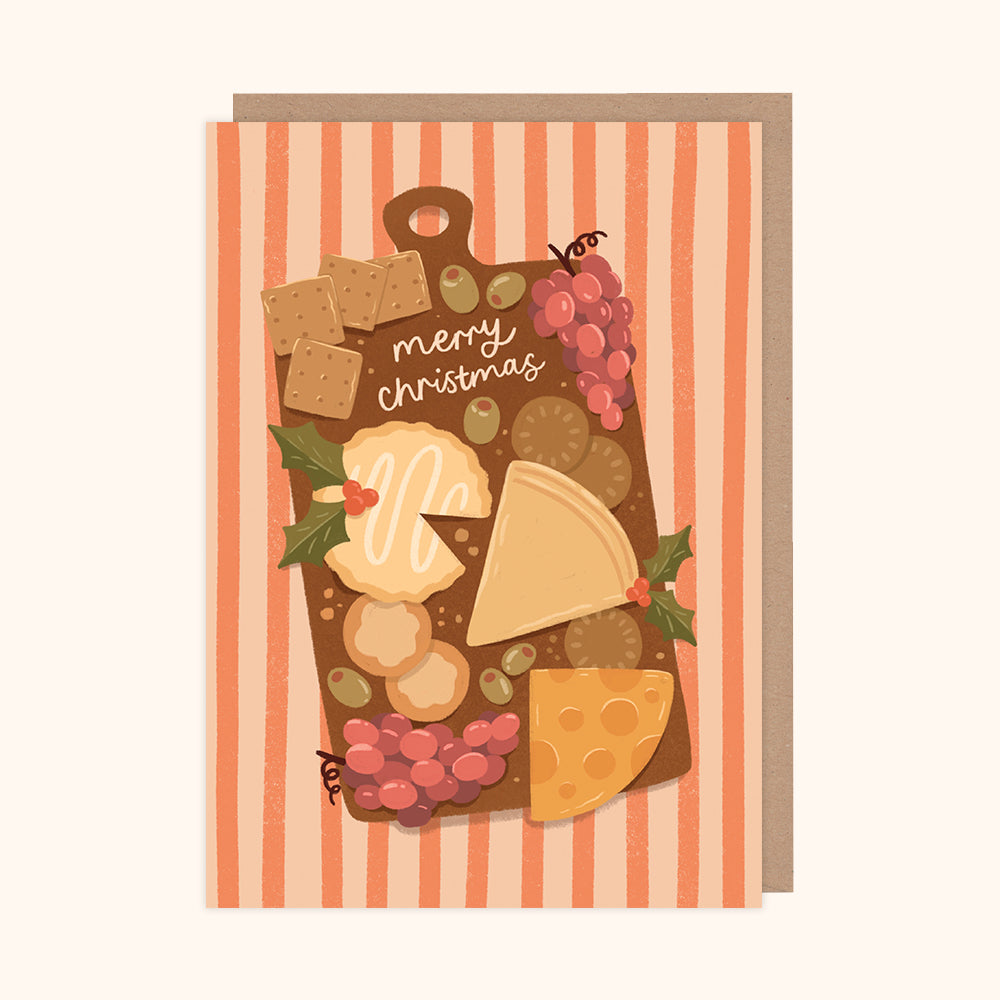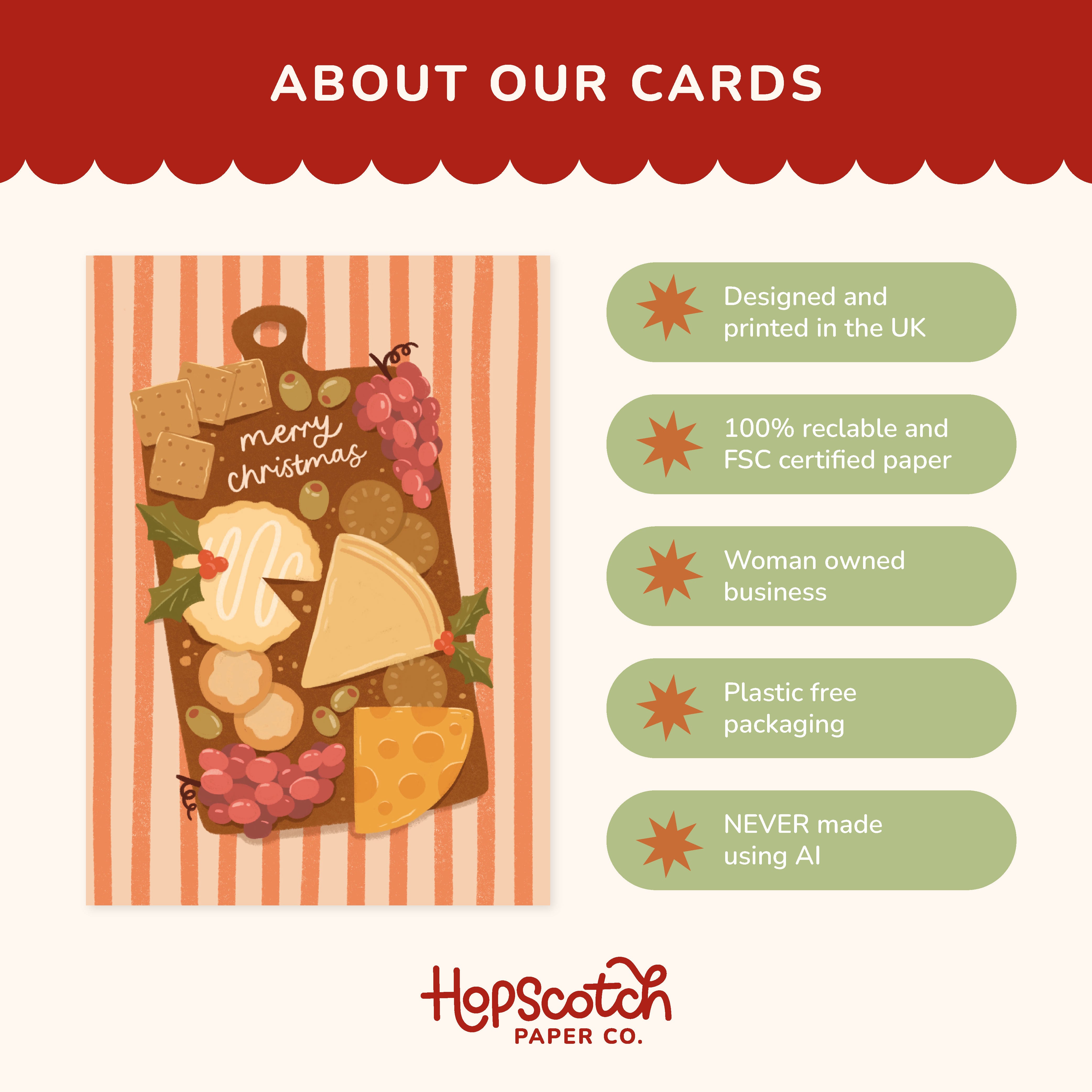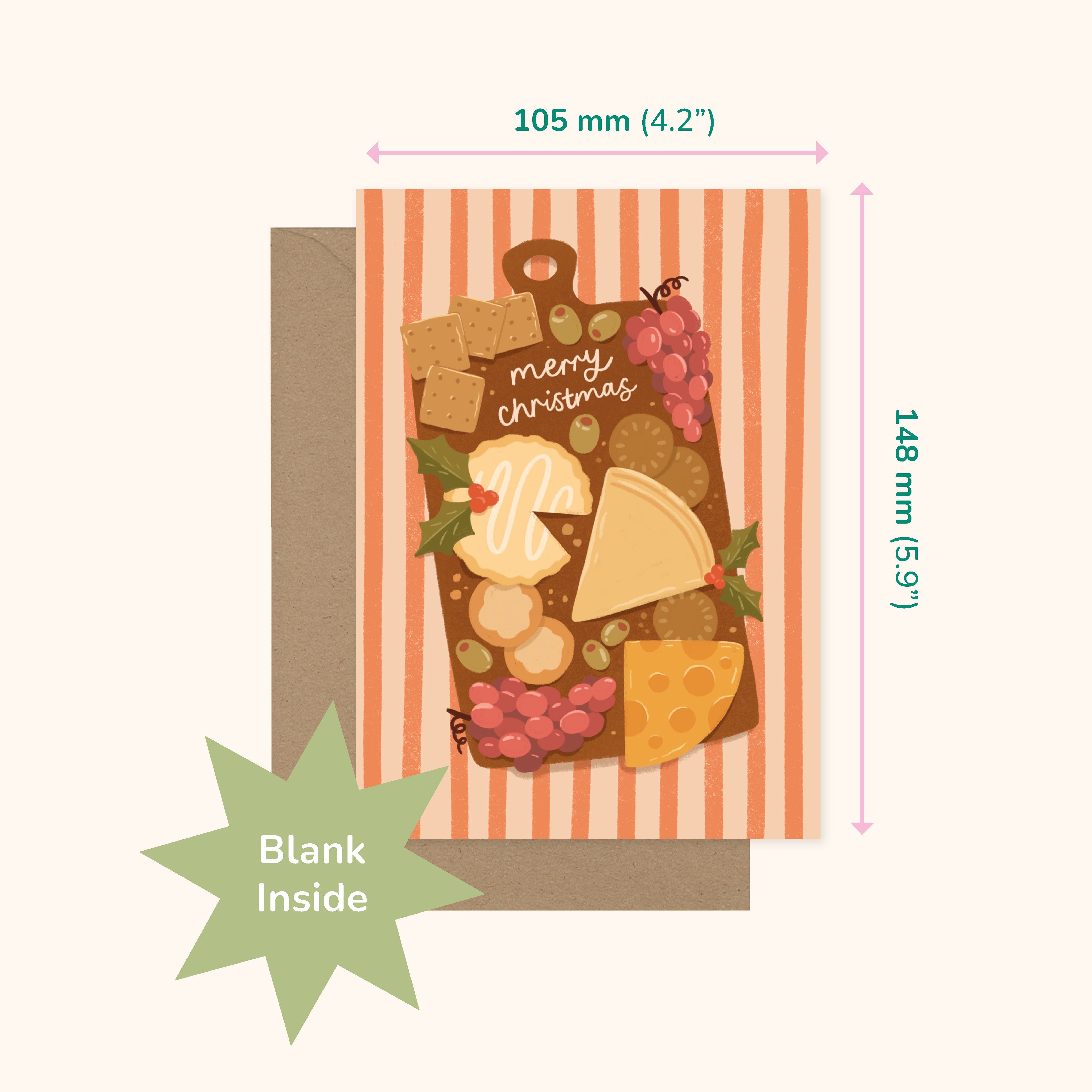 Celebrate the season with this cosy and mouth-watering Christmas card, featuring an illustrated festive cheese board filled with crackers, grapes, brie, cheddar, and seasonal garnishes. A perfect pick for food lovers, entertainers, or anyone who enjoys a tasteful twist on holiday traditions.