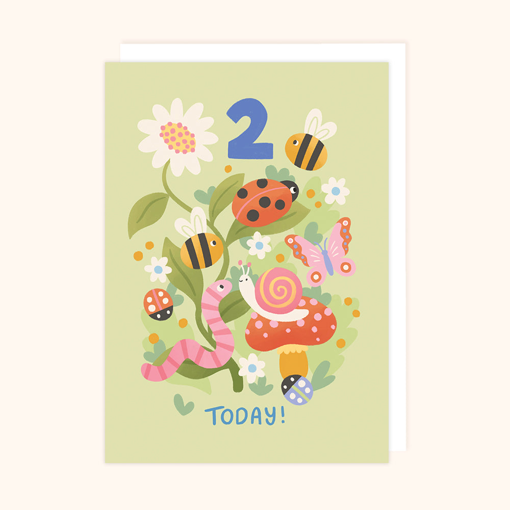 Celebrate their 2nd birthday with this cute animal-themed 2nd birthday card. This colourful design includes ladybirds, bees, butterflies, and a smiling snail among flowers and foliage . This card is part of our Age range.