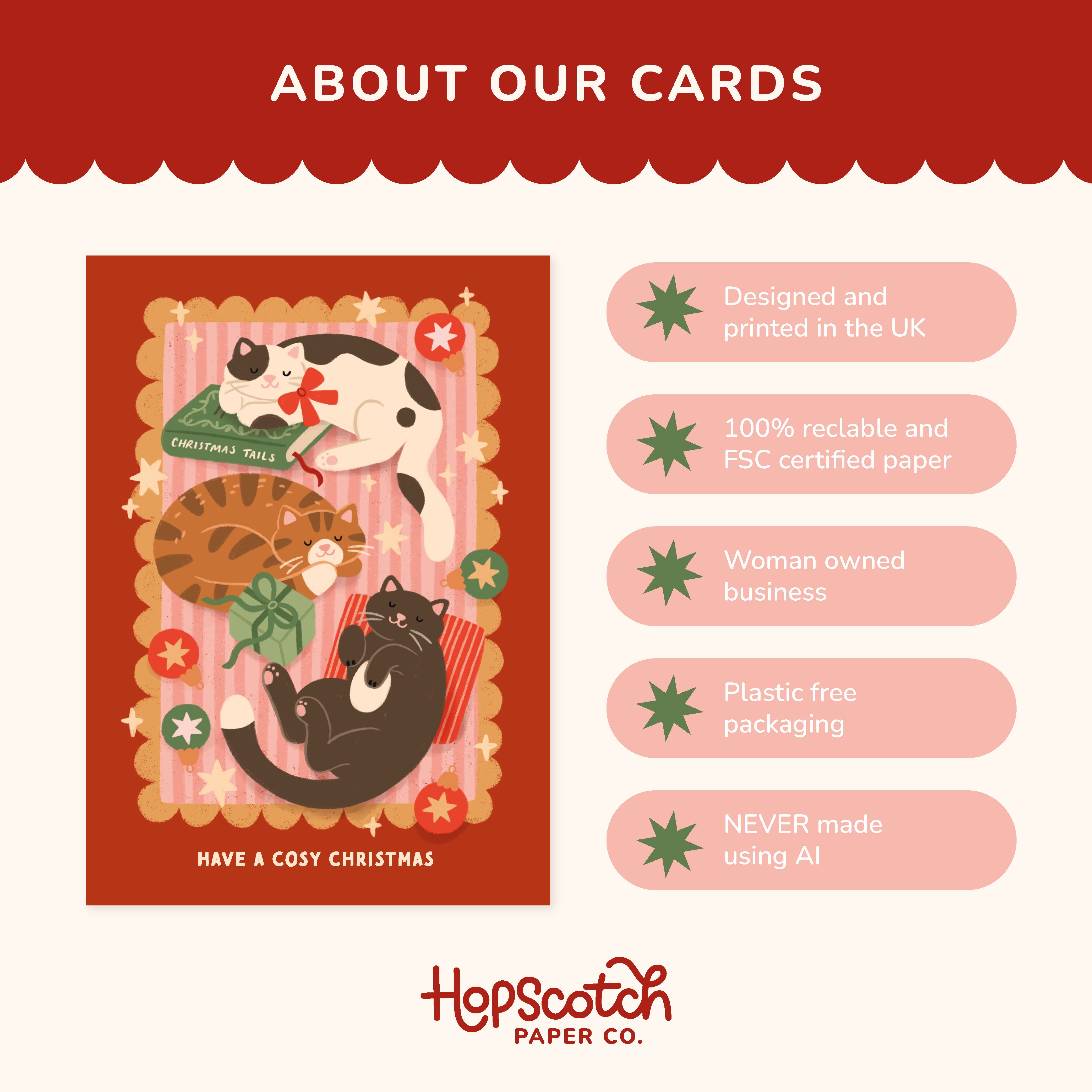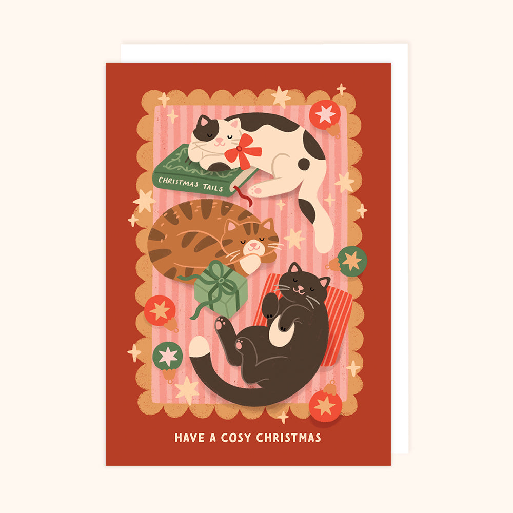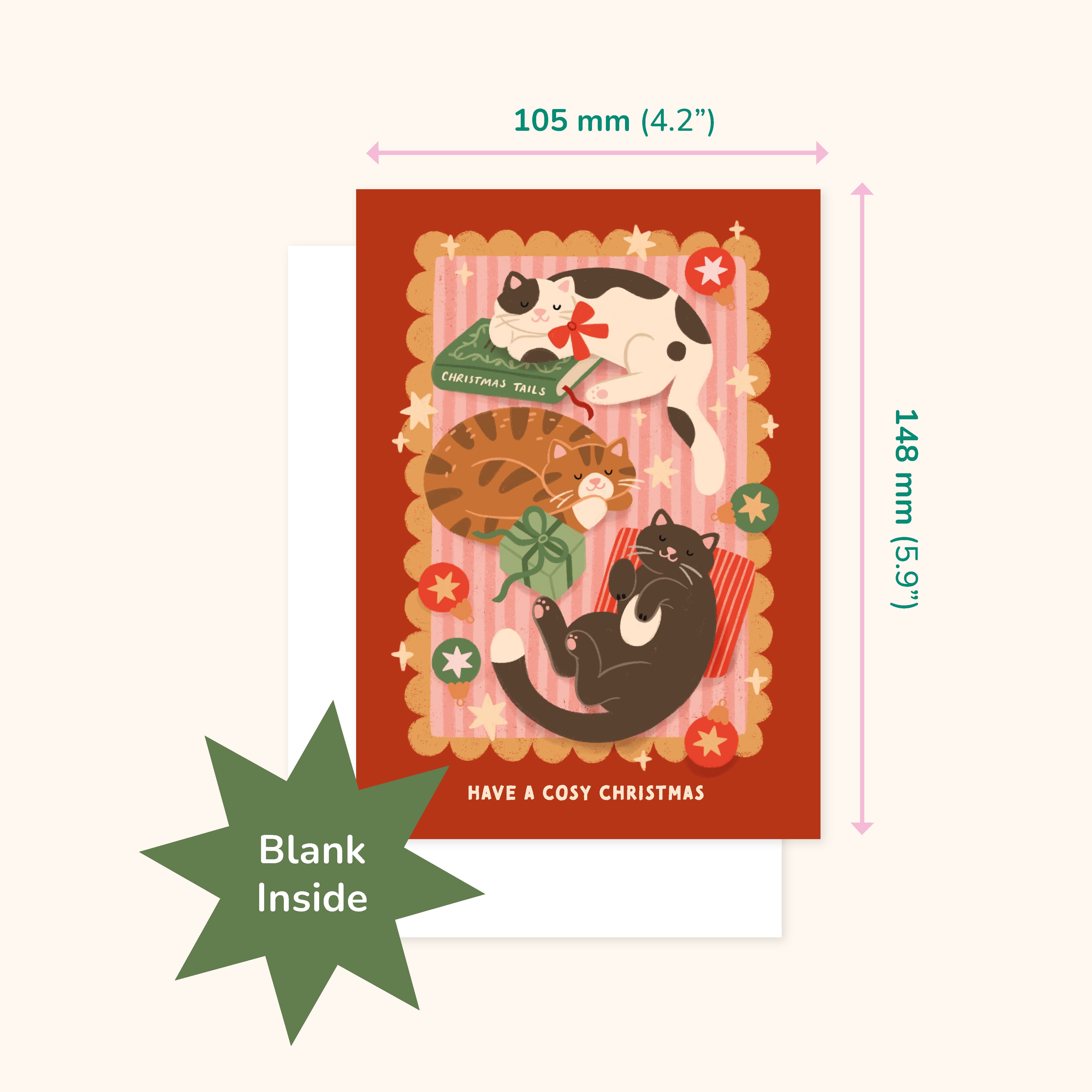 This heartwarming Christmas card features a trio of contented cats snoozing amongst gifts, ornaments, and a festive book titled Christmas Tails. The rich red border and striped background create a cosy holiday feel, making this an ideal choice for cat lovers.