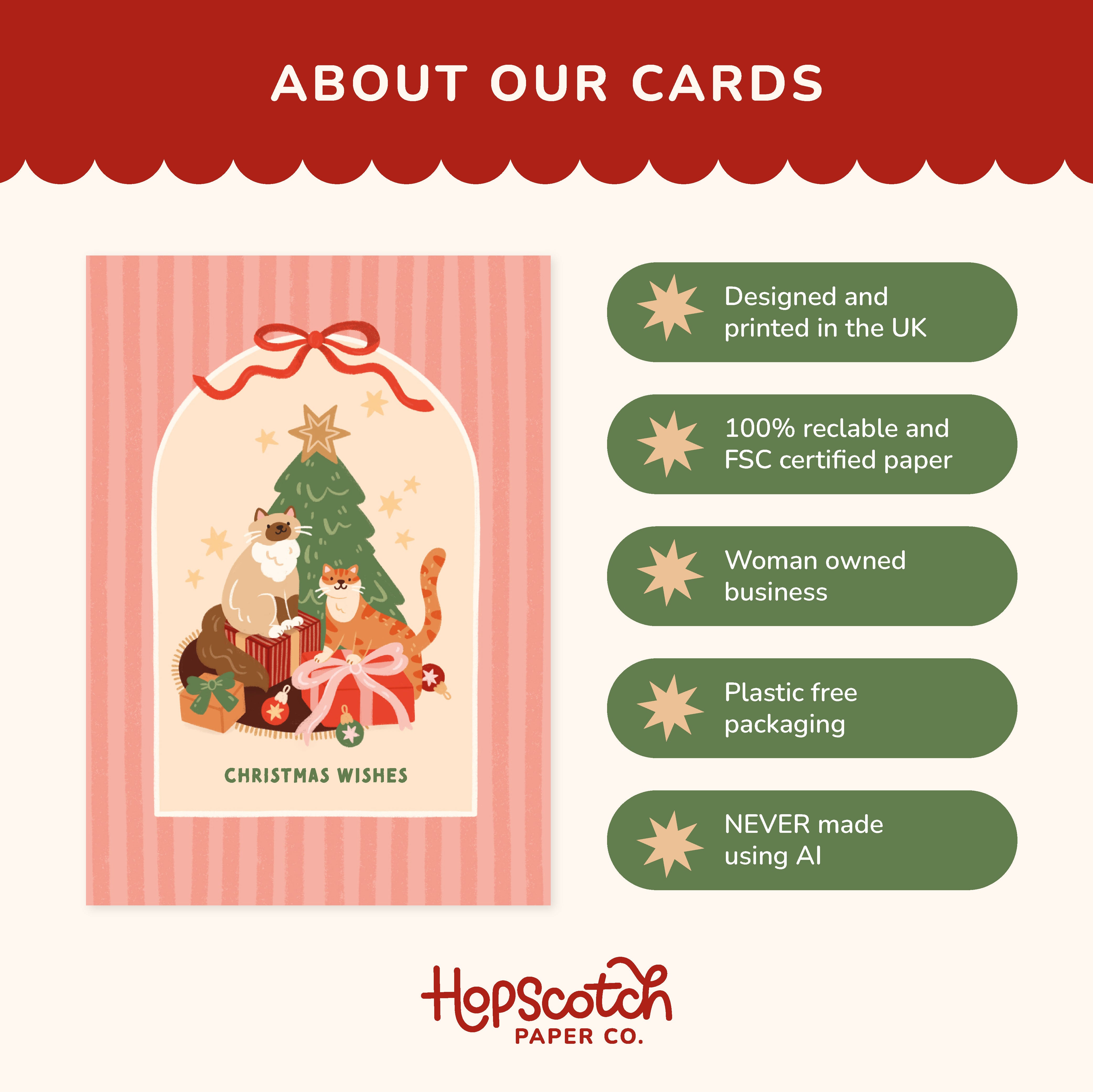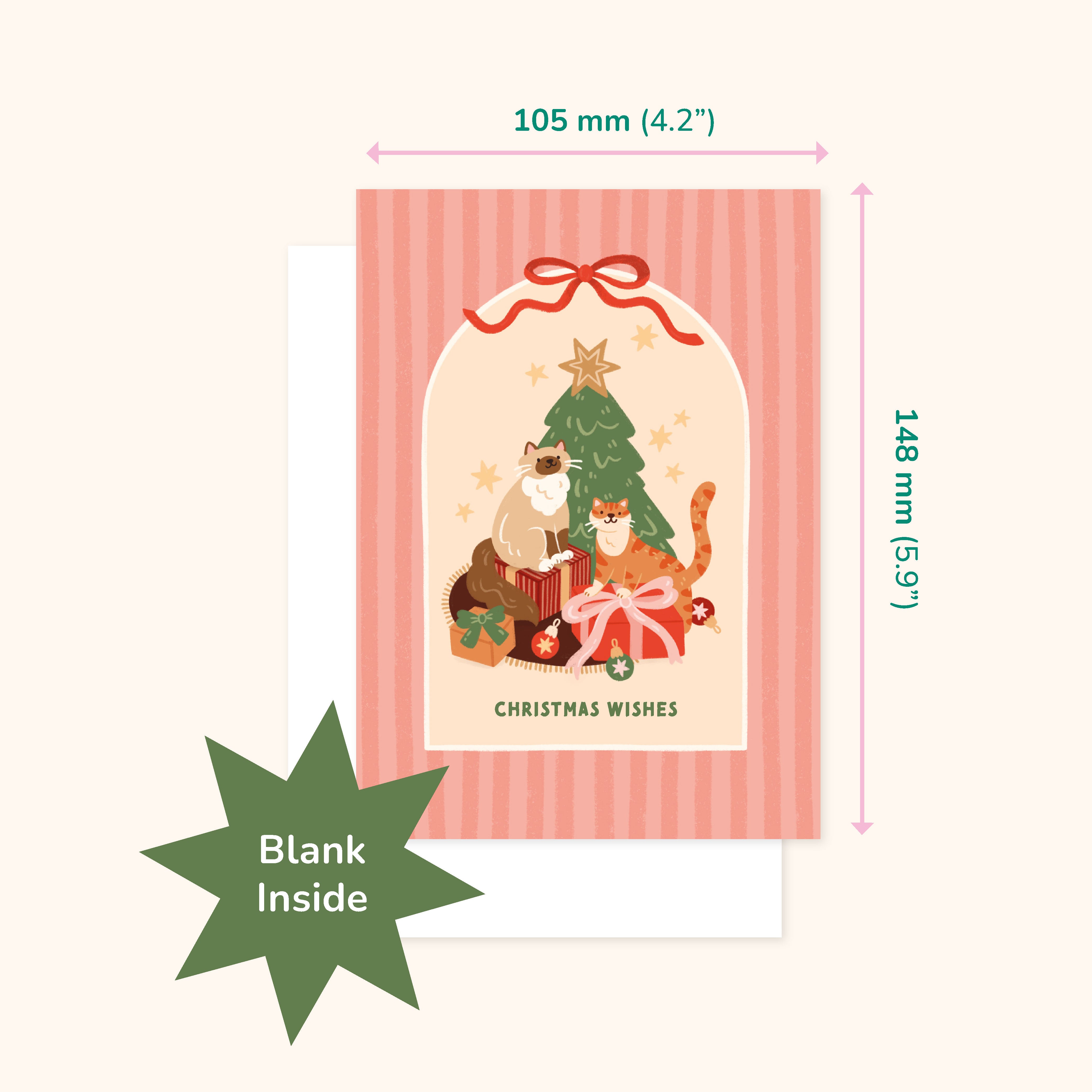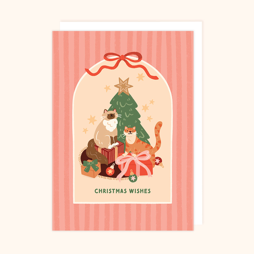 Bring festive charm with this cat-themed Christmas card, featuring a trio of cosy cats nestled around a decorated tree and a stack of wrapped presents. With its warm palette, playful details, and nostalgic stripe background, this design is perfect for cat lovers.