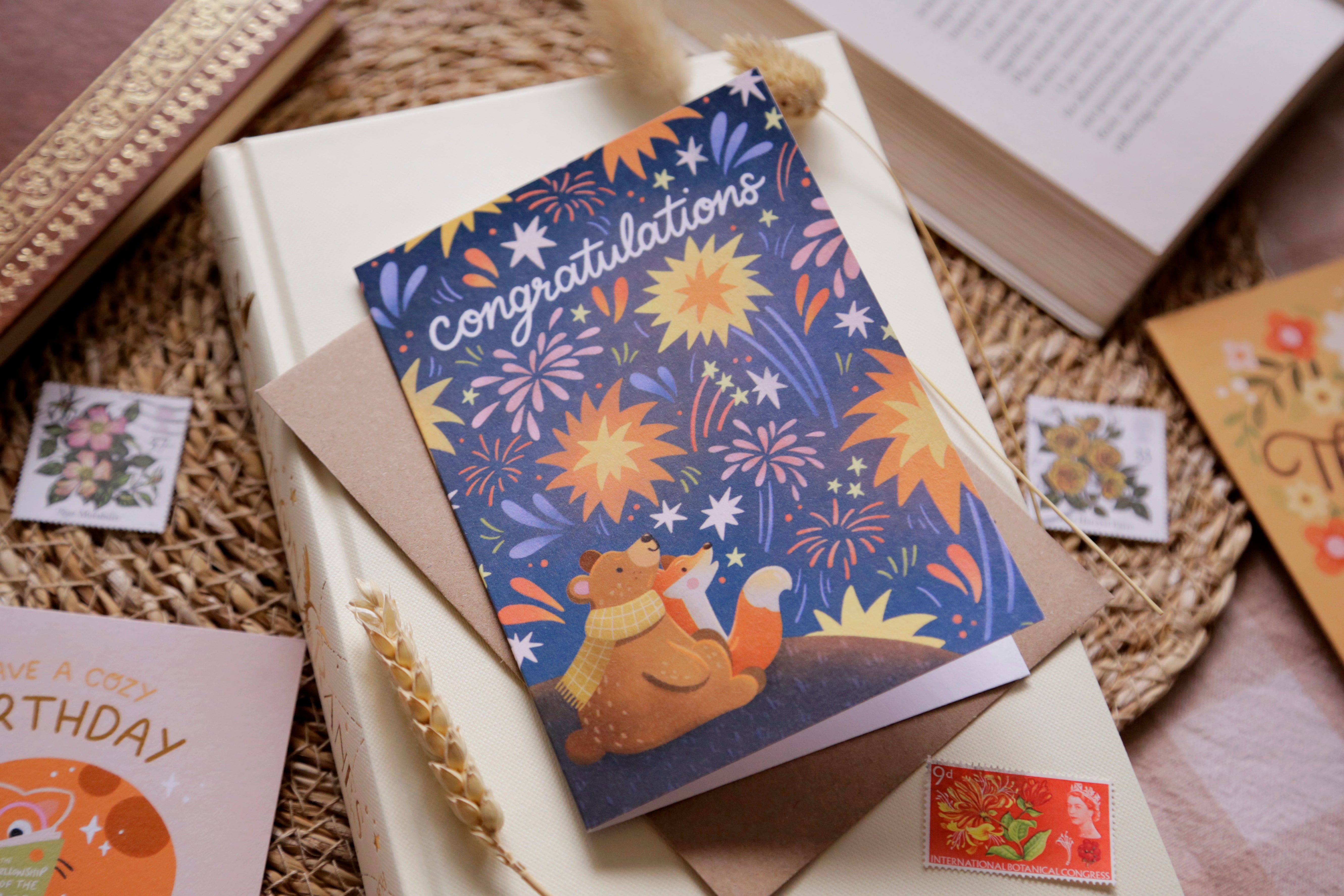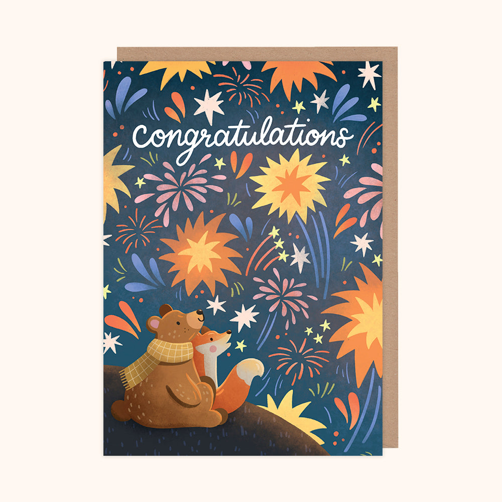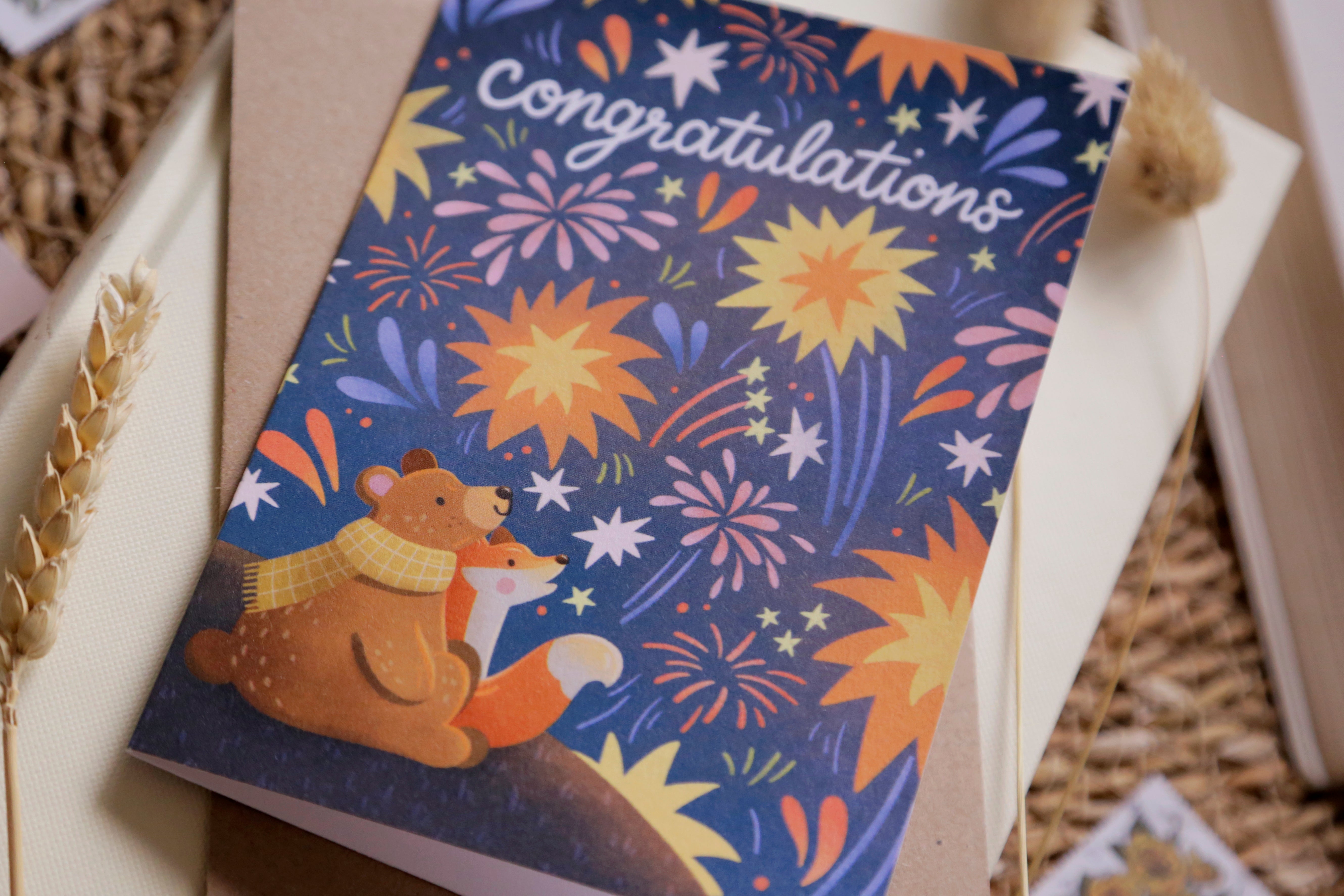 Celebrate success with this elegant "Congratulations" card, featuring vibrant fireworks on the front. Perfect for marking special achievements, this card adds a seasonal touch to heartfelt messages.