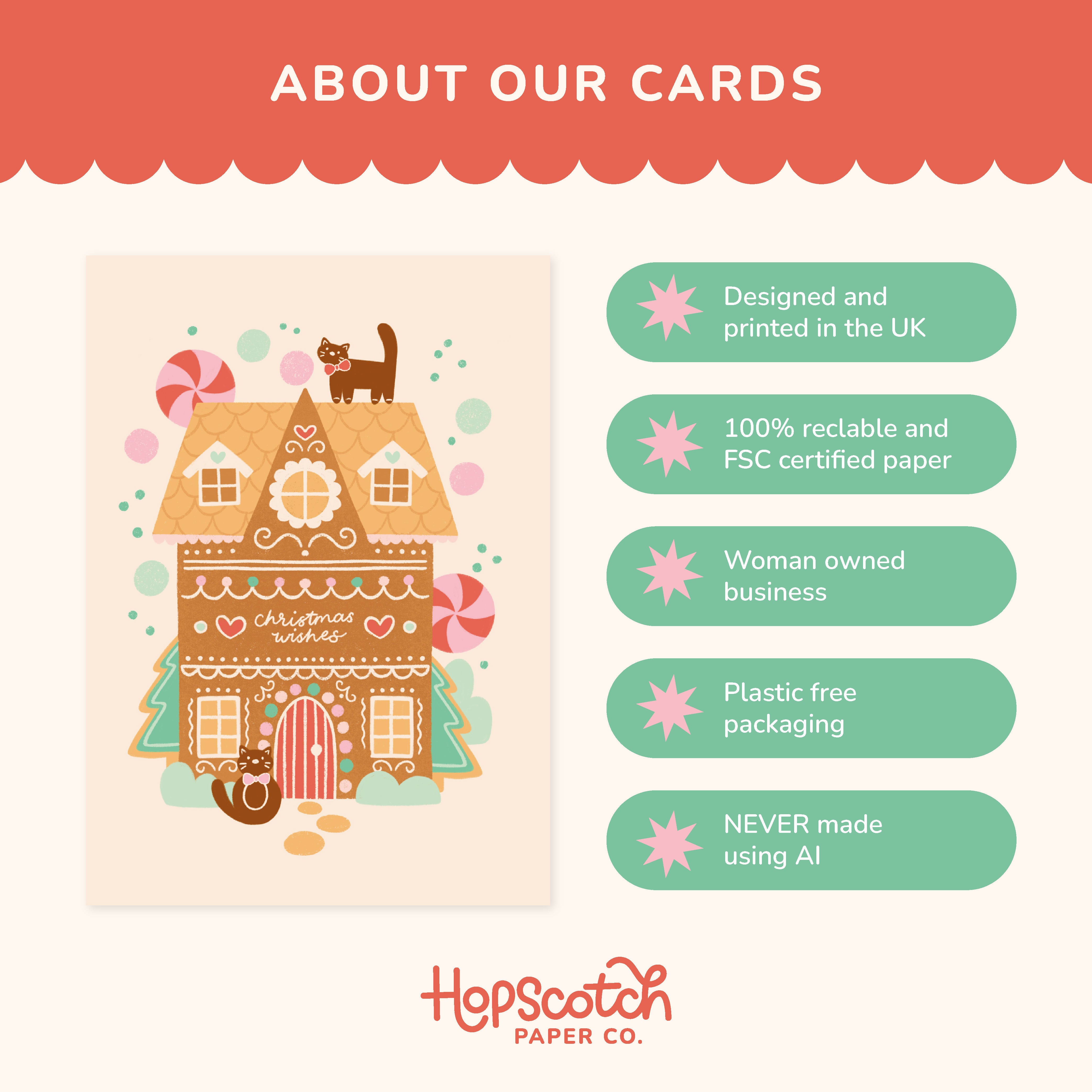 Add a sprinkle of sweetness this Christmas with this cute cat and gingerbread house Christmas card. Featuring two curious kitties exploring a candy-coloured gingerbread cottage, this cheerful design blends cosy charm with festive fun. A perfect pick for cat lovers and anyone who enjoys a playful, imaginative holiday greeting.