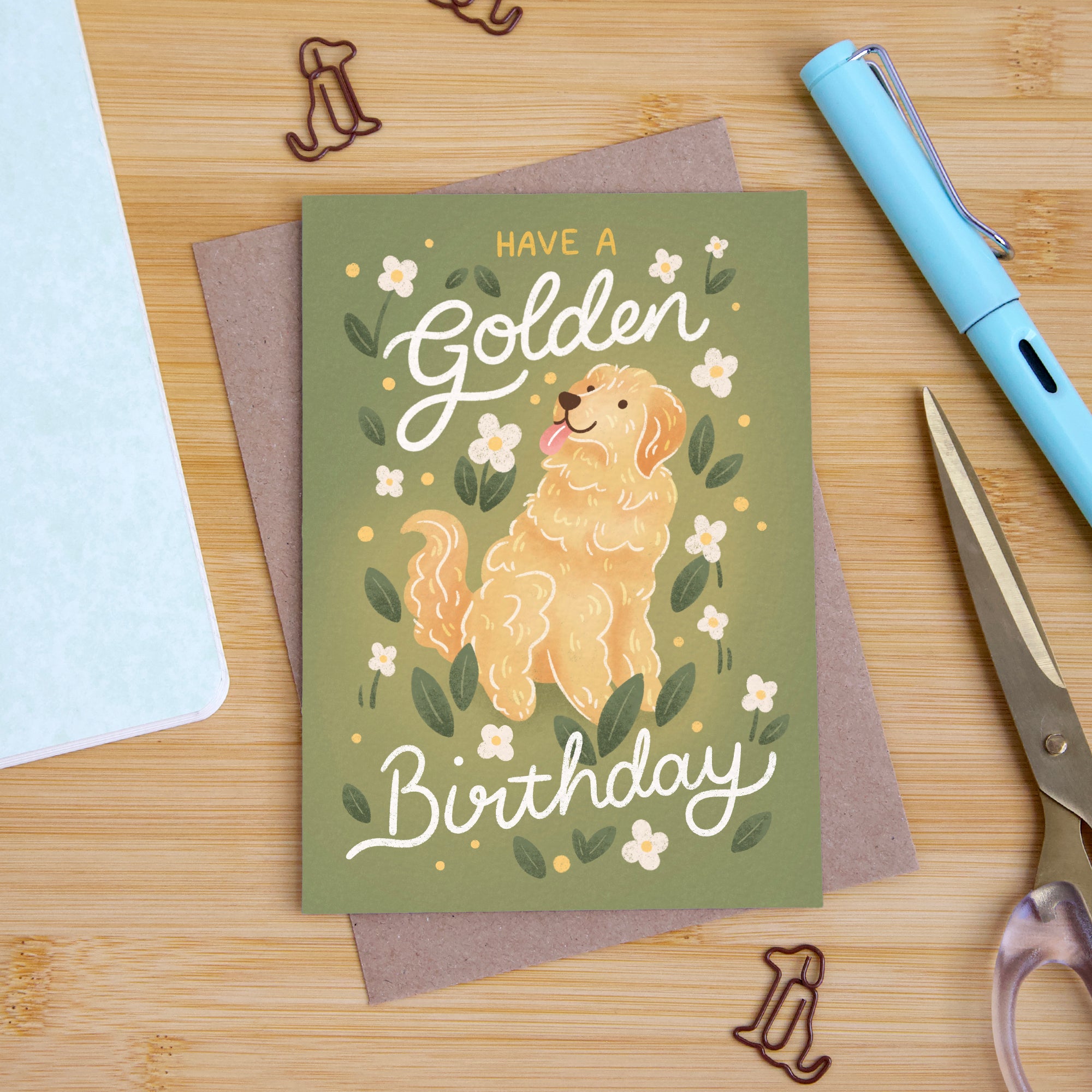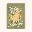 Celebrate in style with our golden birthday card featuring an adorable golden retriever! This illustrated card is sure to bring a smile to any dog lover's face. Perfect for wishing someone a "paw"-some birthday. This card is part of our dog-themed birthday card collection.