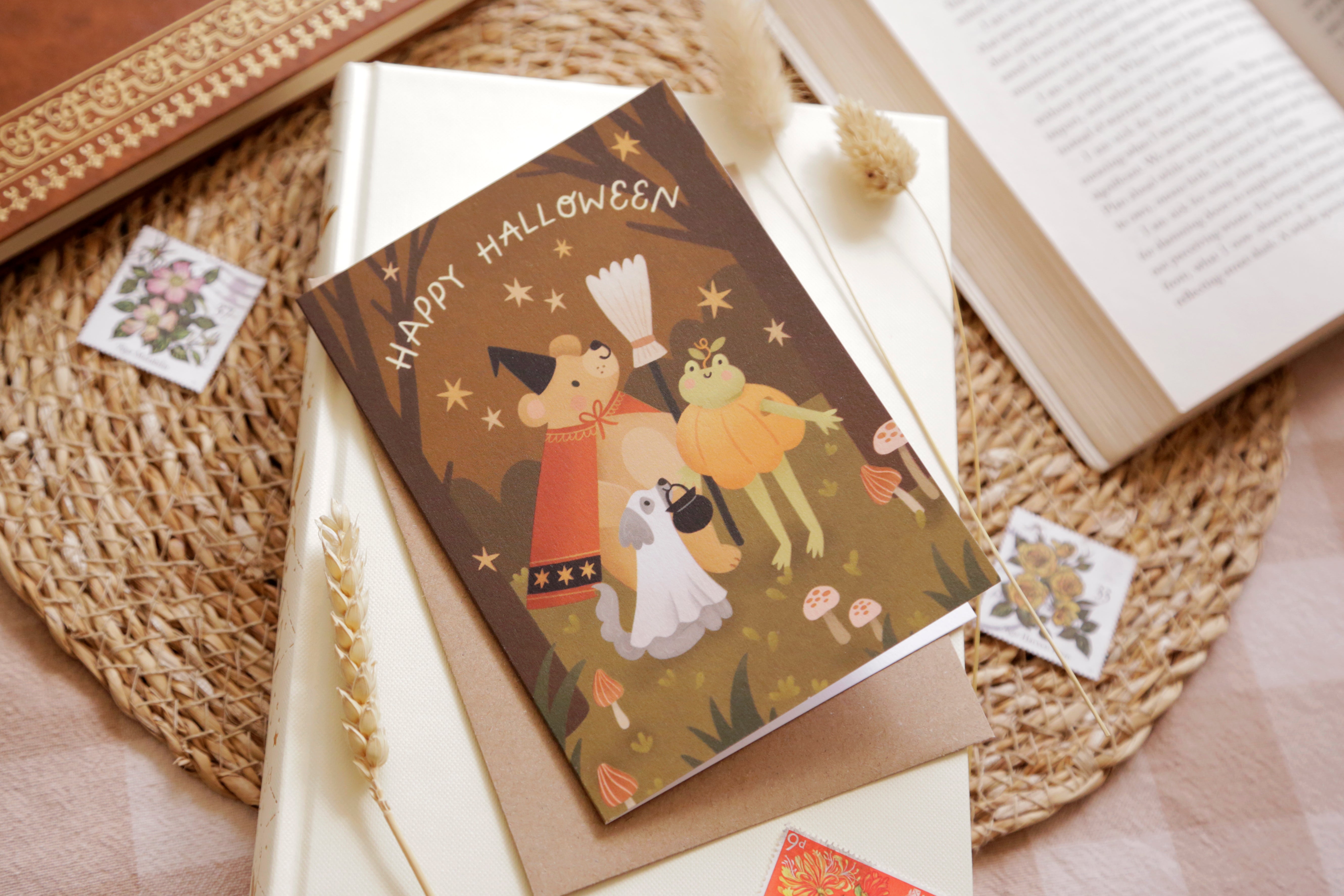 The A6 card (105 x 148mm) is printed on premium 280gsm paper and includes a kraft envelope. It’s plastic-free, recyclable, and printed on eco-friendly FSC-certified paper in the UK. Blank inside for your message, this adorable halloween card is a charming way to send spooky wishes!