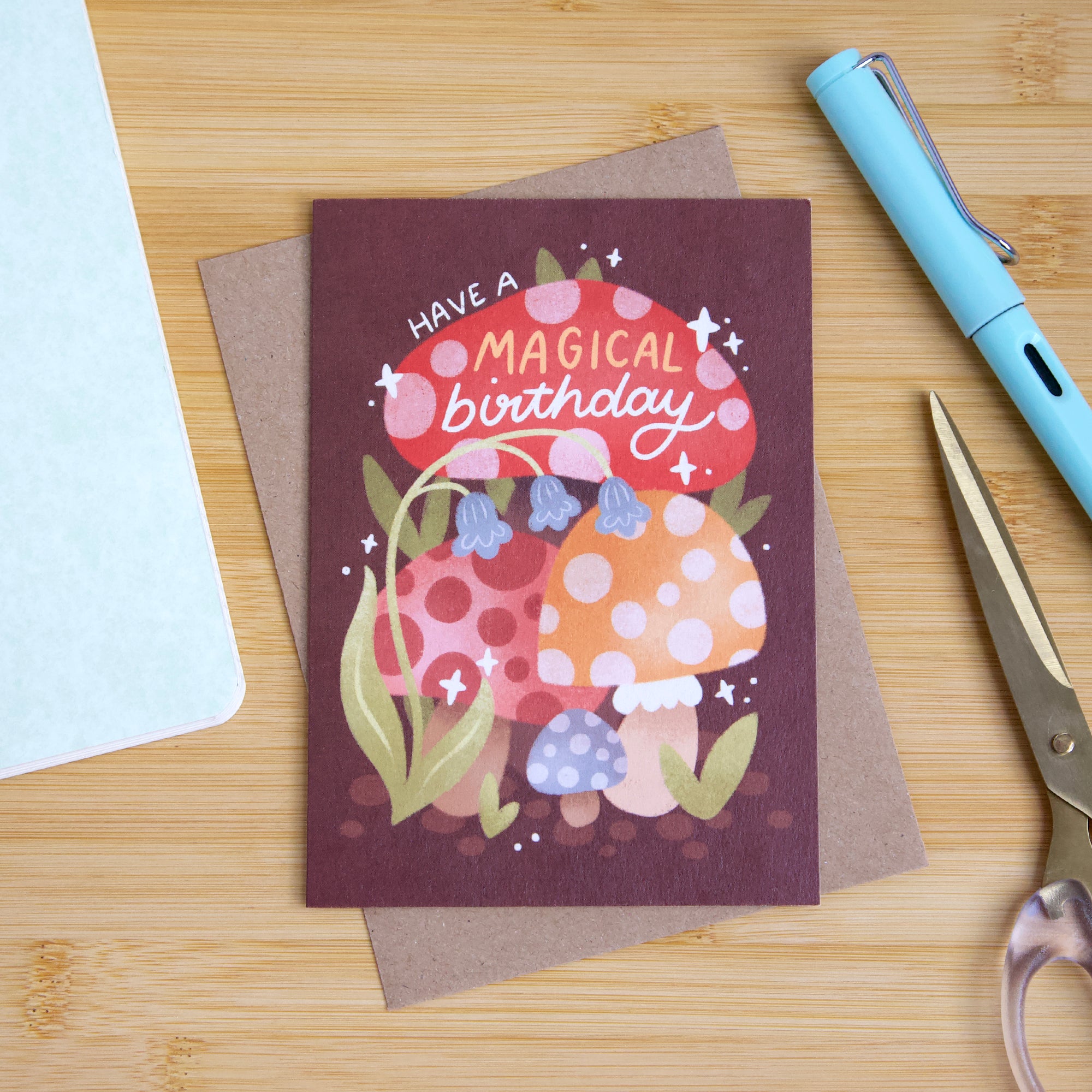 Wish them a magical birthday with this unique mushroom-themed birthday card. This card features a selection of illustrated toadstools and reads "have a magical birthday".