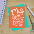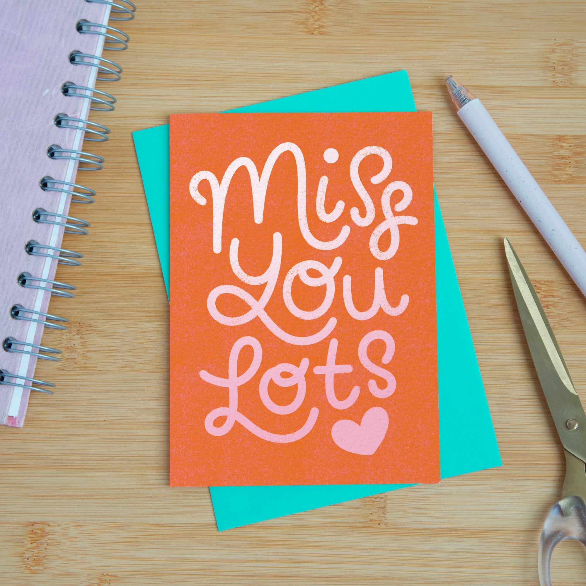 Let your friends, family and loved ones know you're thinking about them with this adorable "miss you lots" card. This lovely miss you card features playful typography against a bold red background.