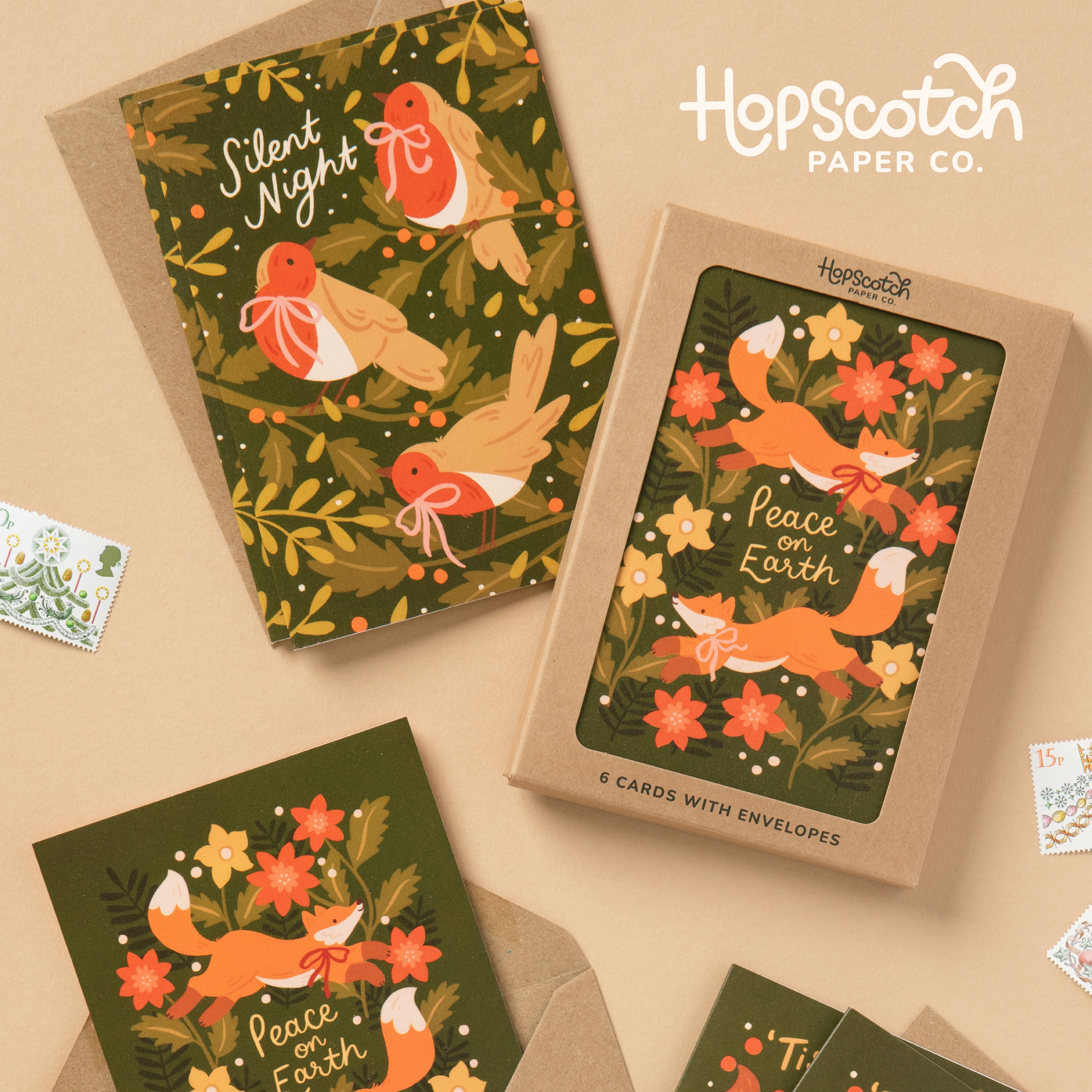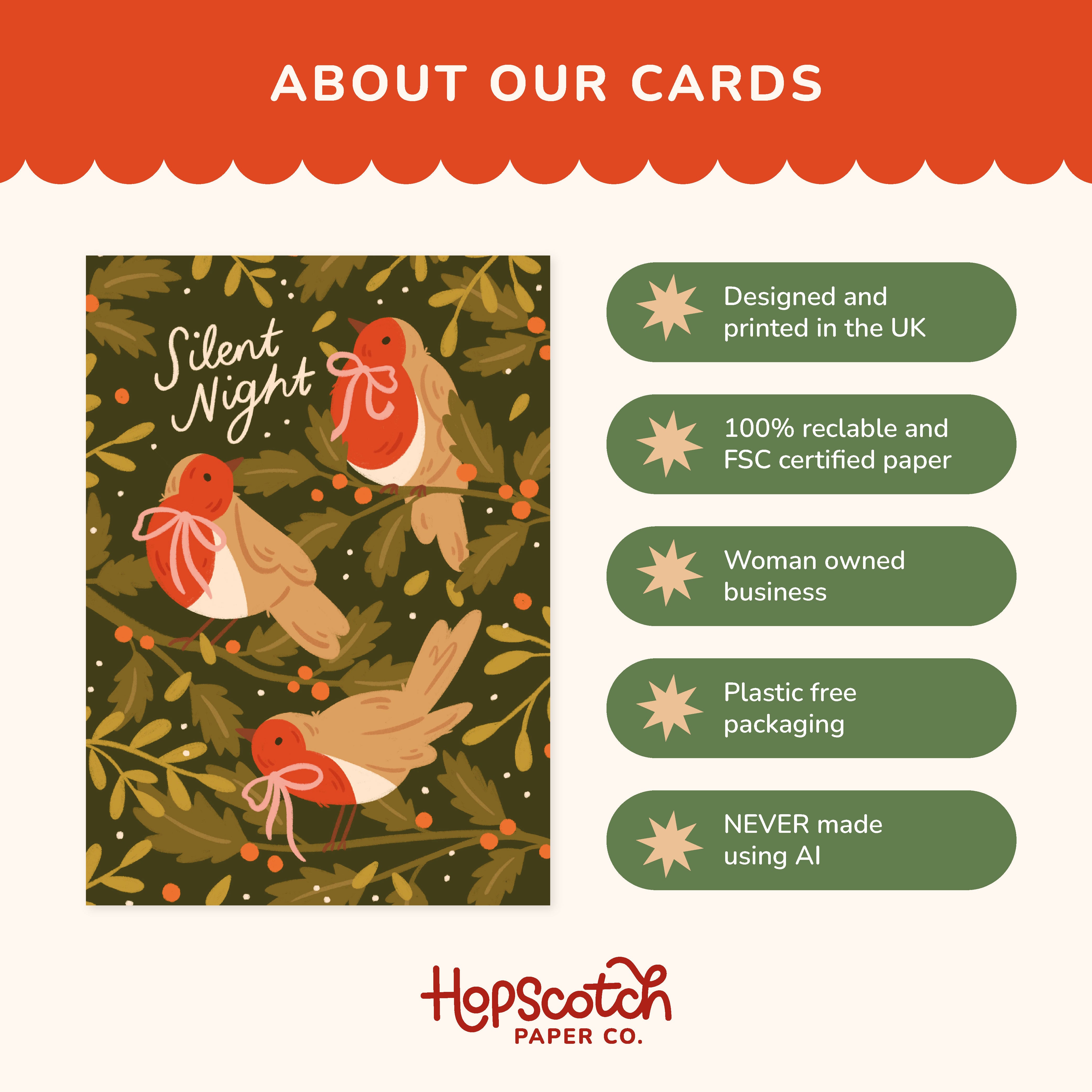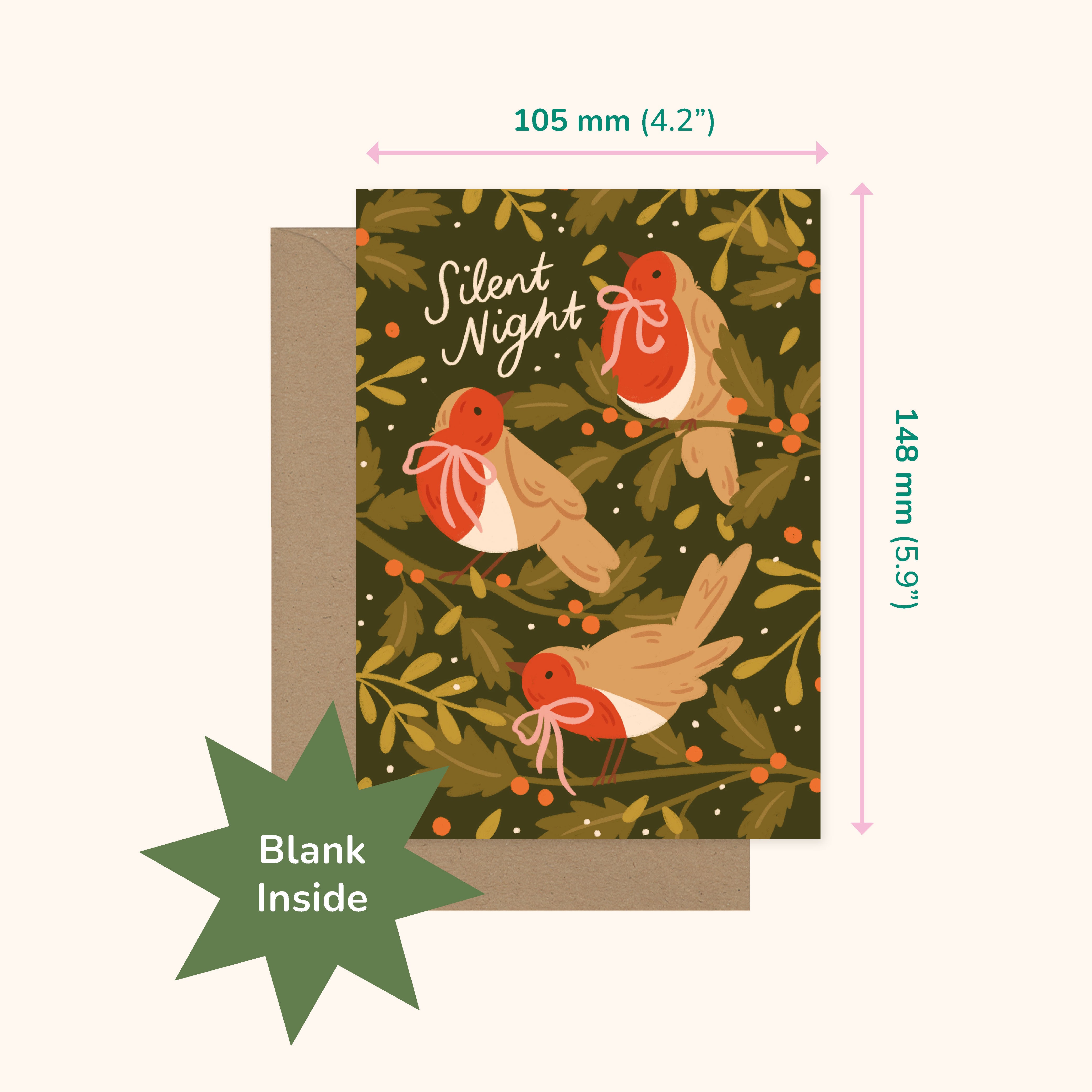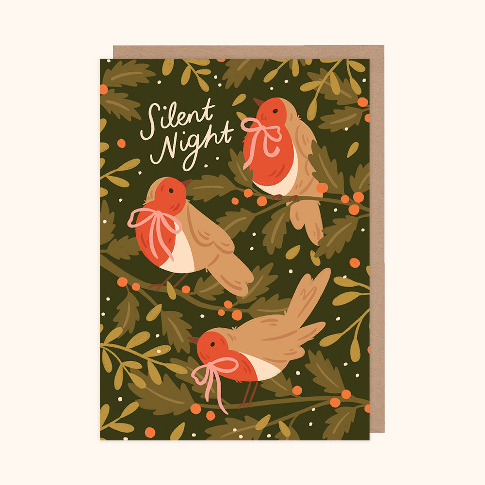 A beautifully illustrated Christmas card featuring three robins perched among wintry foliage and berries, each wearing with a ribbon and set against a deep green background. The hand-lettered “Silent Night” adds a classic seasonal touch, perfect for traditional yet charming festive designs.