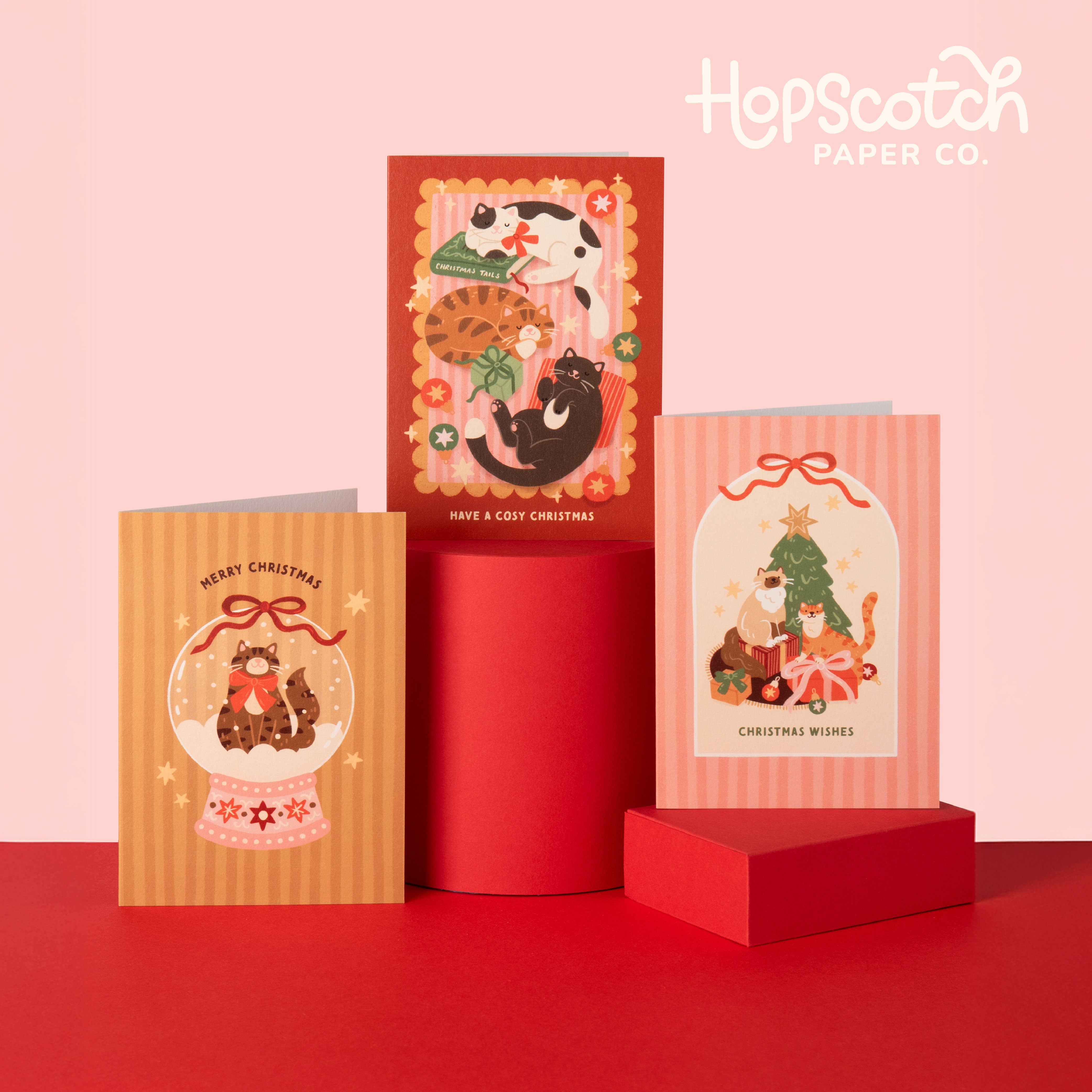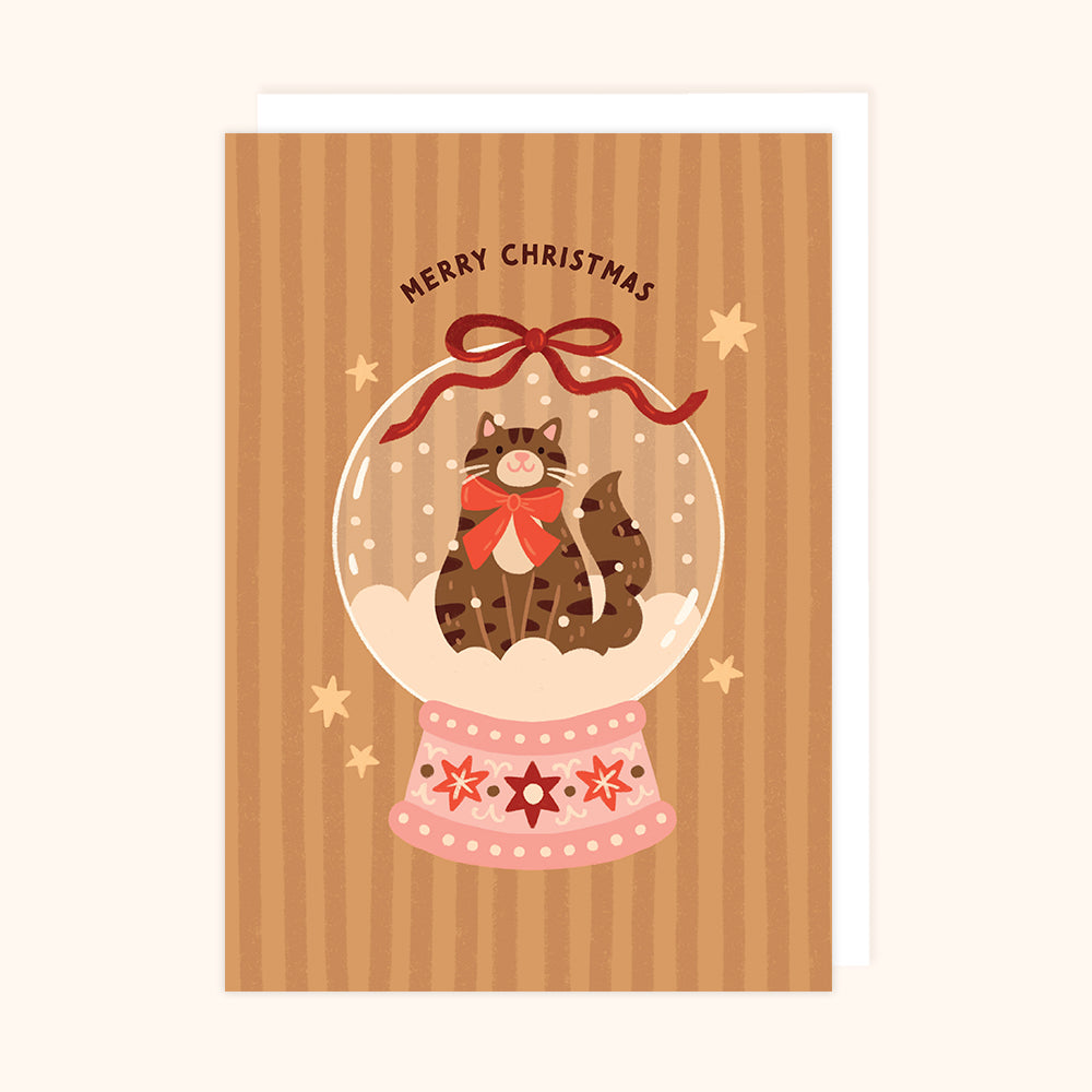 Send a touch of festive magic with this illustrated cat snow globe Christmas card. Featuring a happy tabby wearing a red bow, nestled in a snow globe with delicate stars and a cosy striped background, this design brings warmth, whimsy and universal appeal, perfect for cat lovers and festive stationery fans.