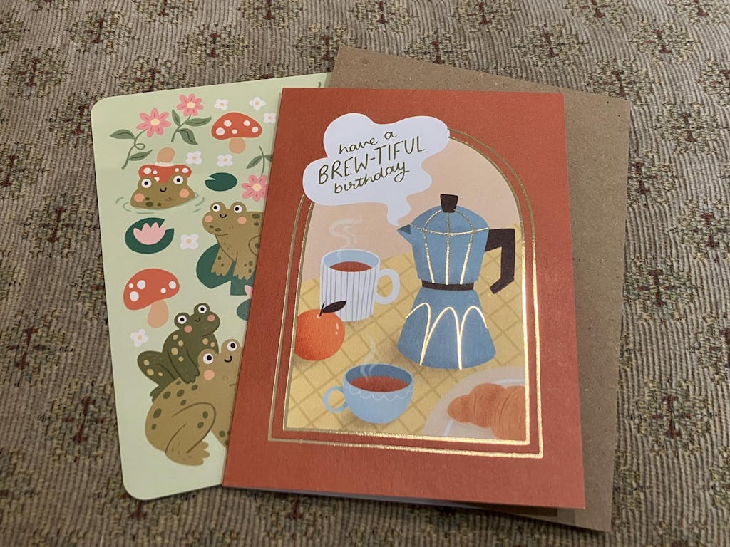 This unique birthday card features an espresso pot with two cups of coffee and a croissant. It is finished with gold foiling for that extra luxurious feeling, and is sure to make that morning coffee on their special day even more magical.