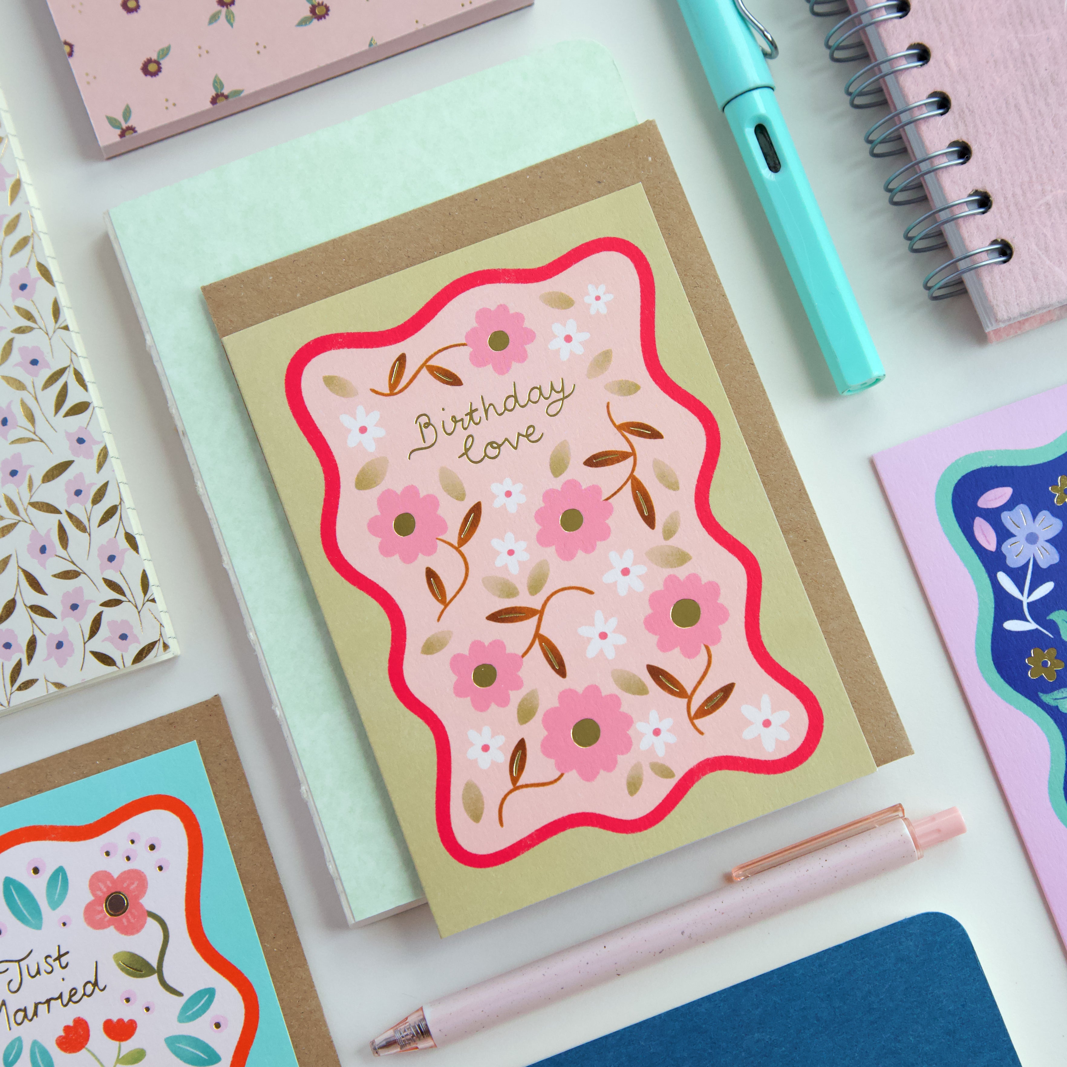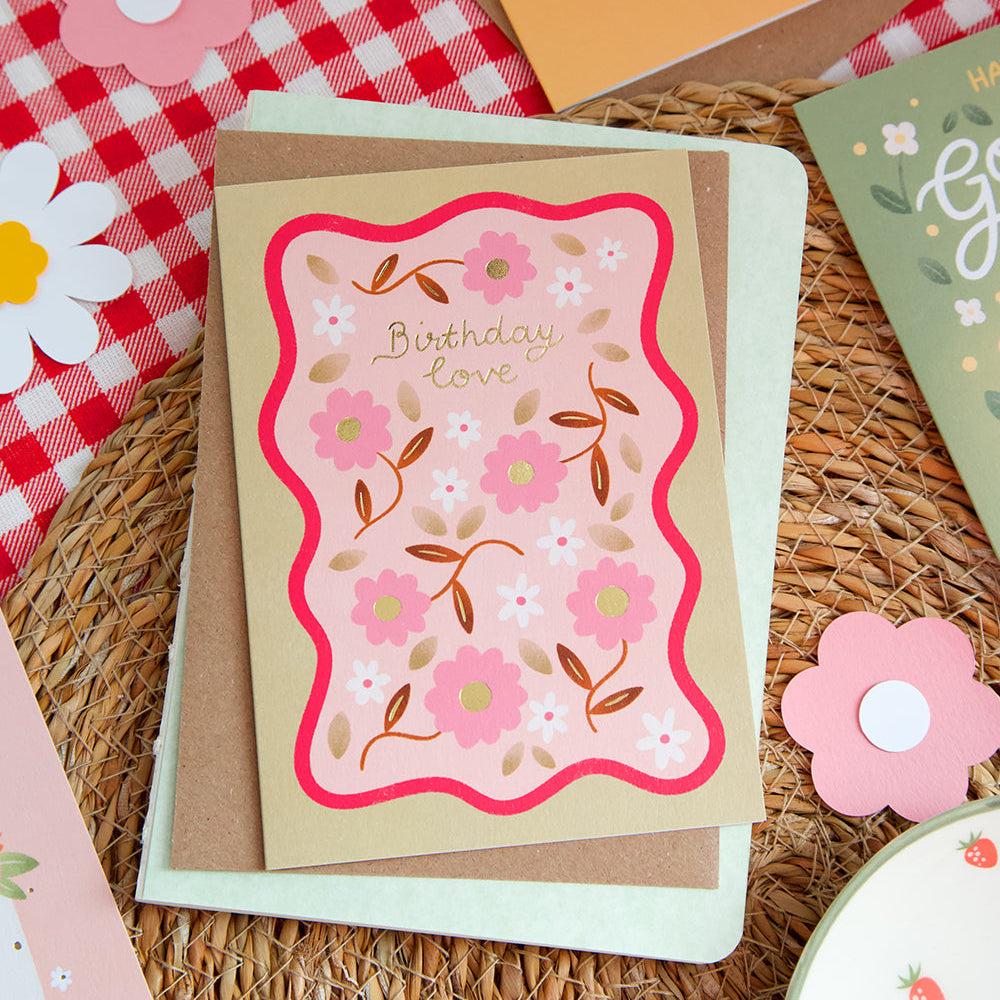 Send beautiful birthday wishes with this stunning, gold-foiled floral birthday card. This unique greeting card has been designed with love to make magical moments even more special. It features a selection of pink & white flowers and reads "birthday love".