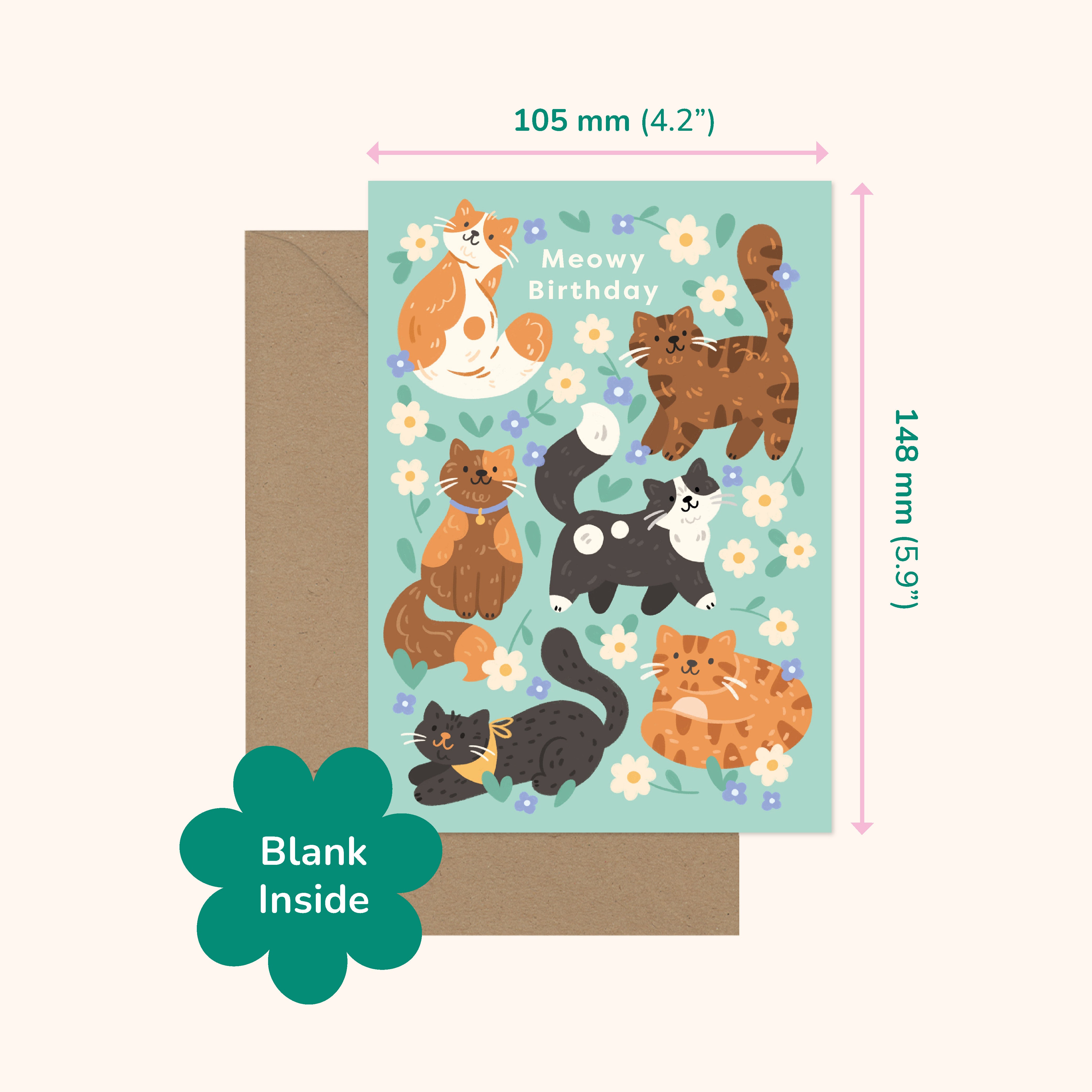 Celebrate someone special with this adorable cat-themed birthday card! Featuring a playful design of cute kitties surrounded by flowers, this card is ideal for anyone who loves cats, kittens, or all things feline.