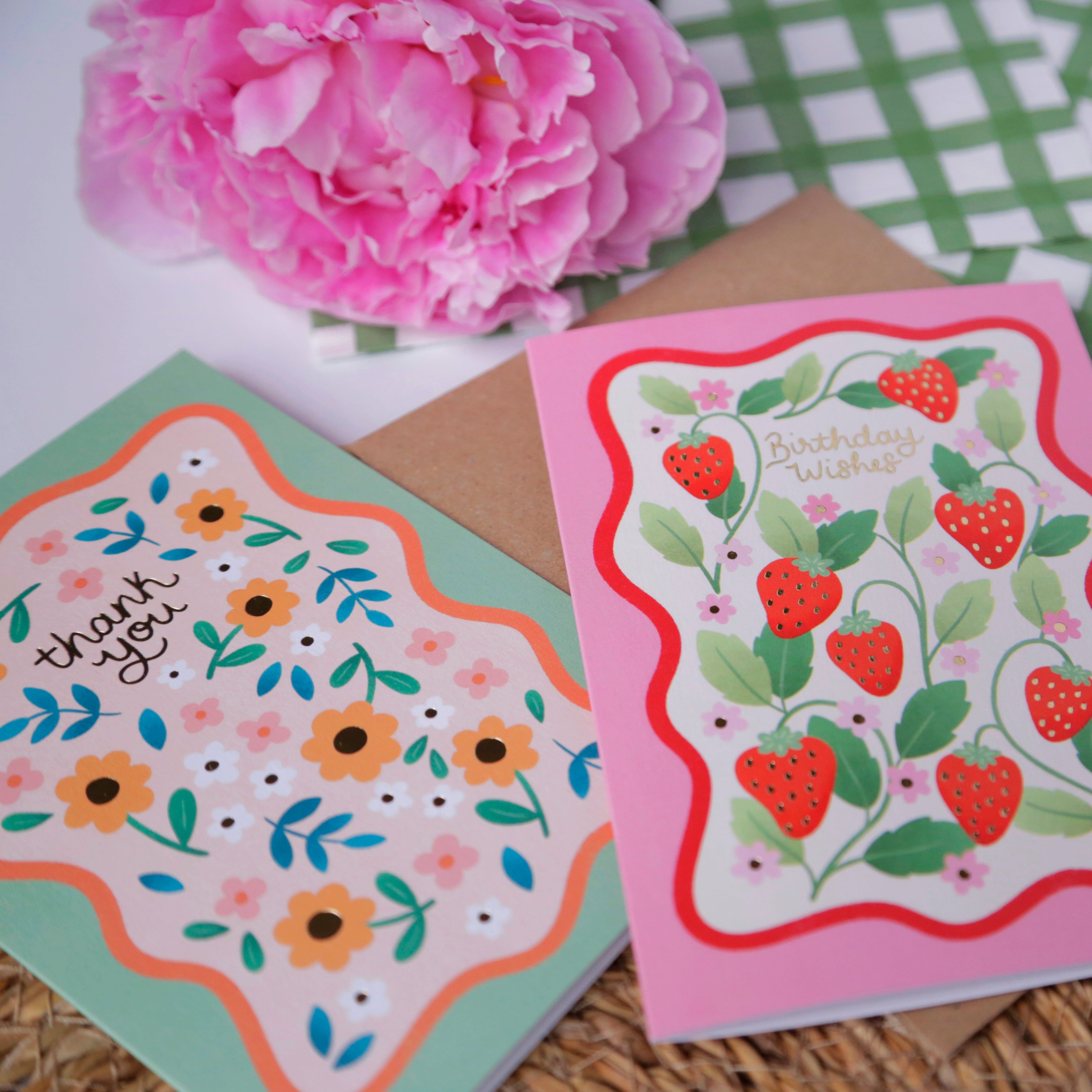 Luxury strawberry birthday card featuring a stunning strawberry & floral illustration and finished with gold foiling. Perfect for a spring or summer Birthday, or just for your strawberry-loving friend!