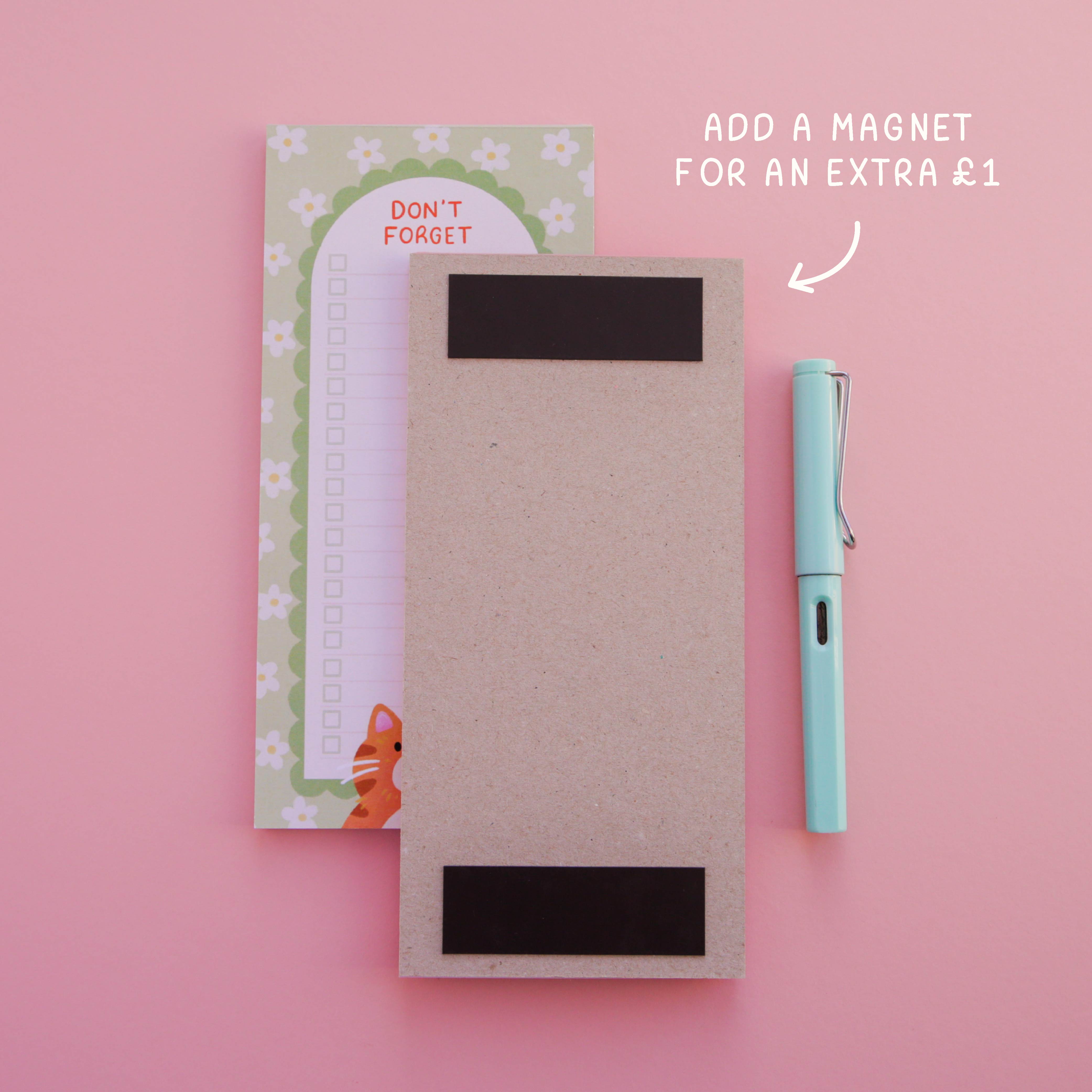 For an extra £1.00, we'll add magnets to the back so you can stick your notepad on the fridge, perfect for shopping lists and meal planning. (Please note, magnets are attached with adhesive so we don't recommend trying to remove them.)