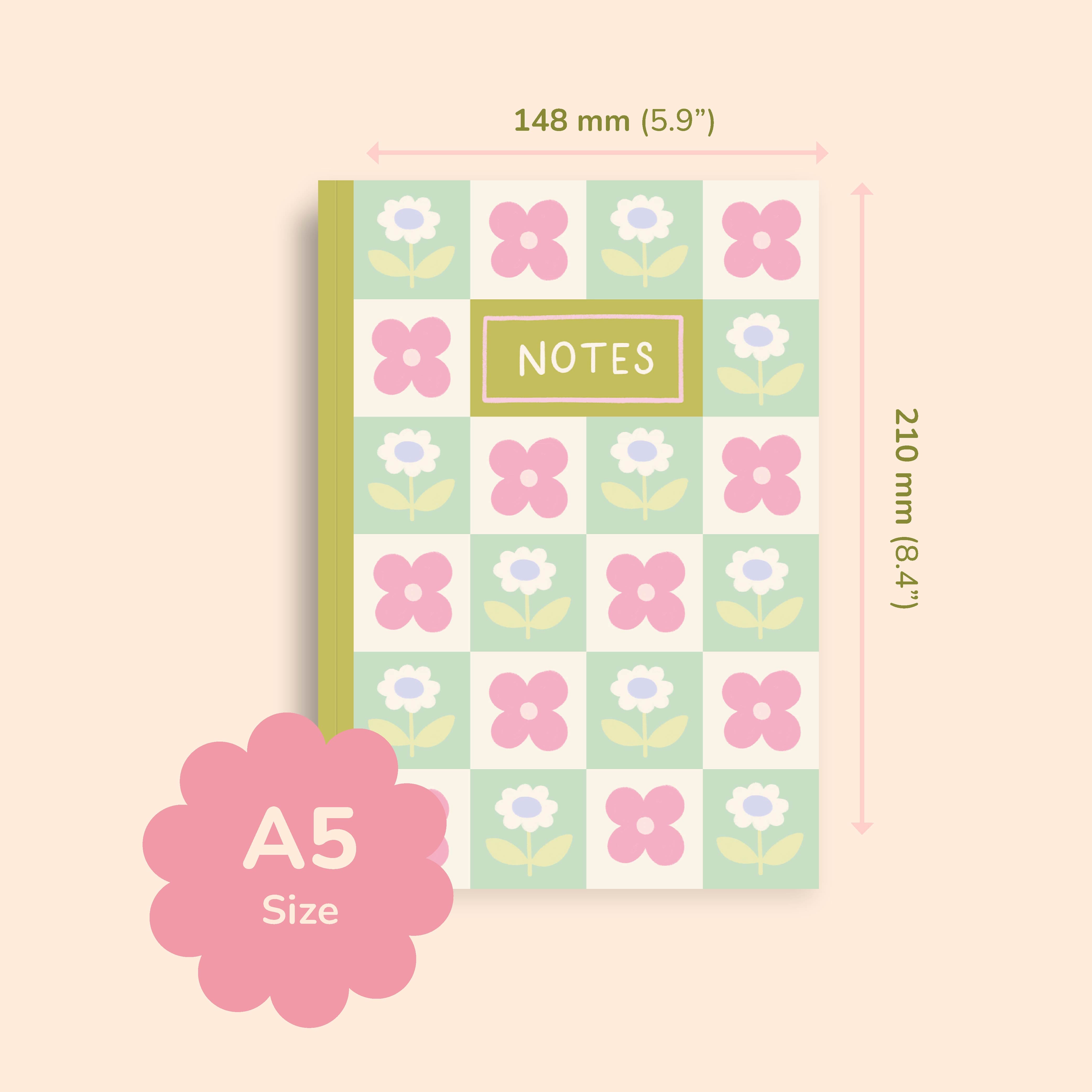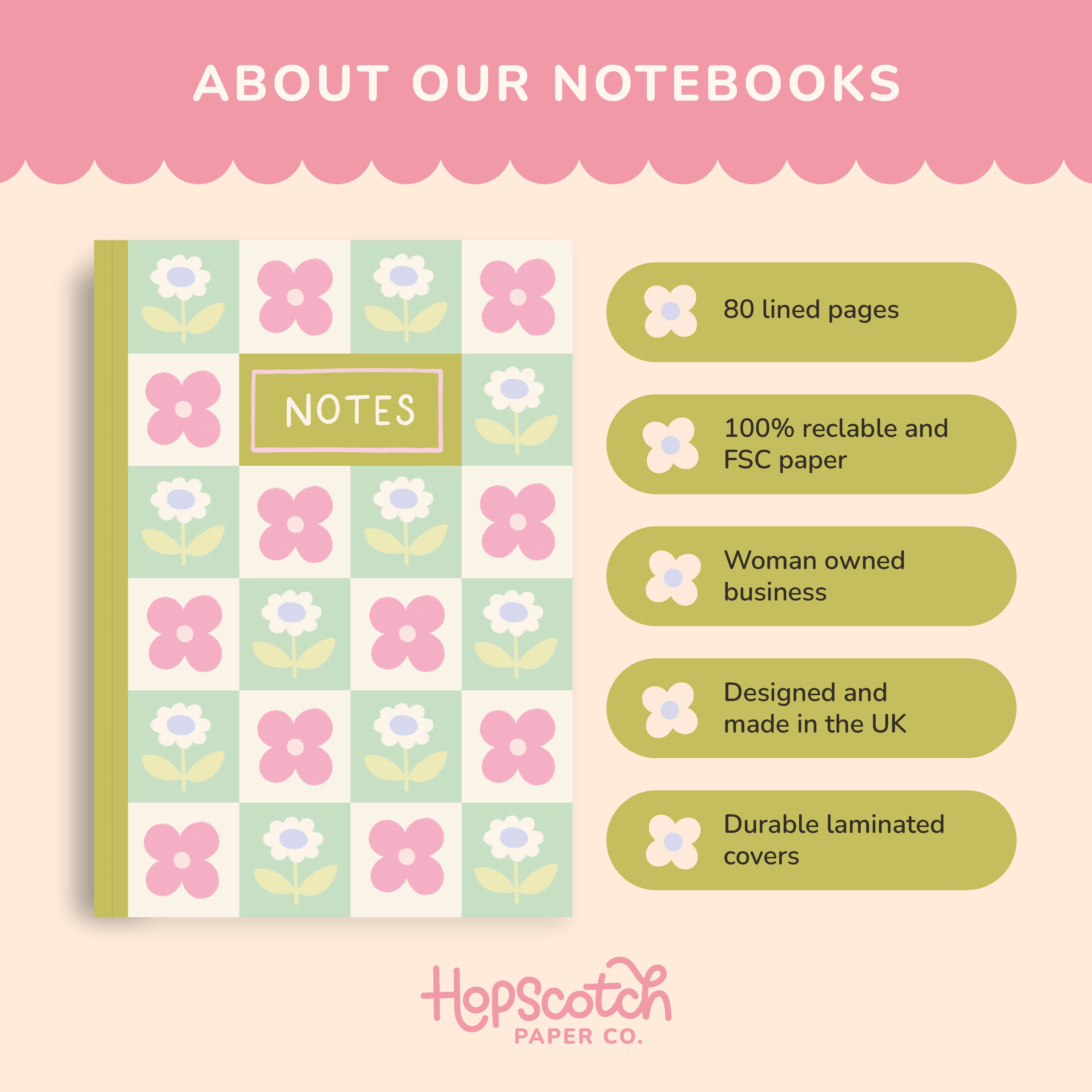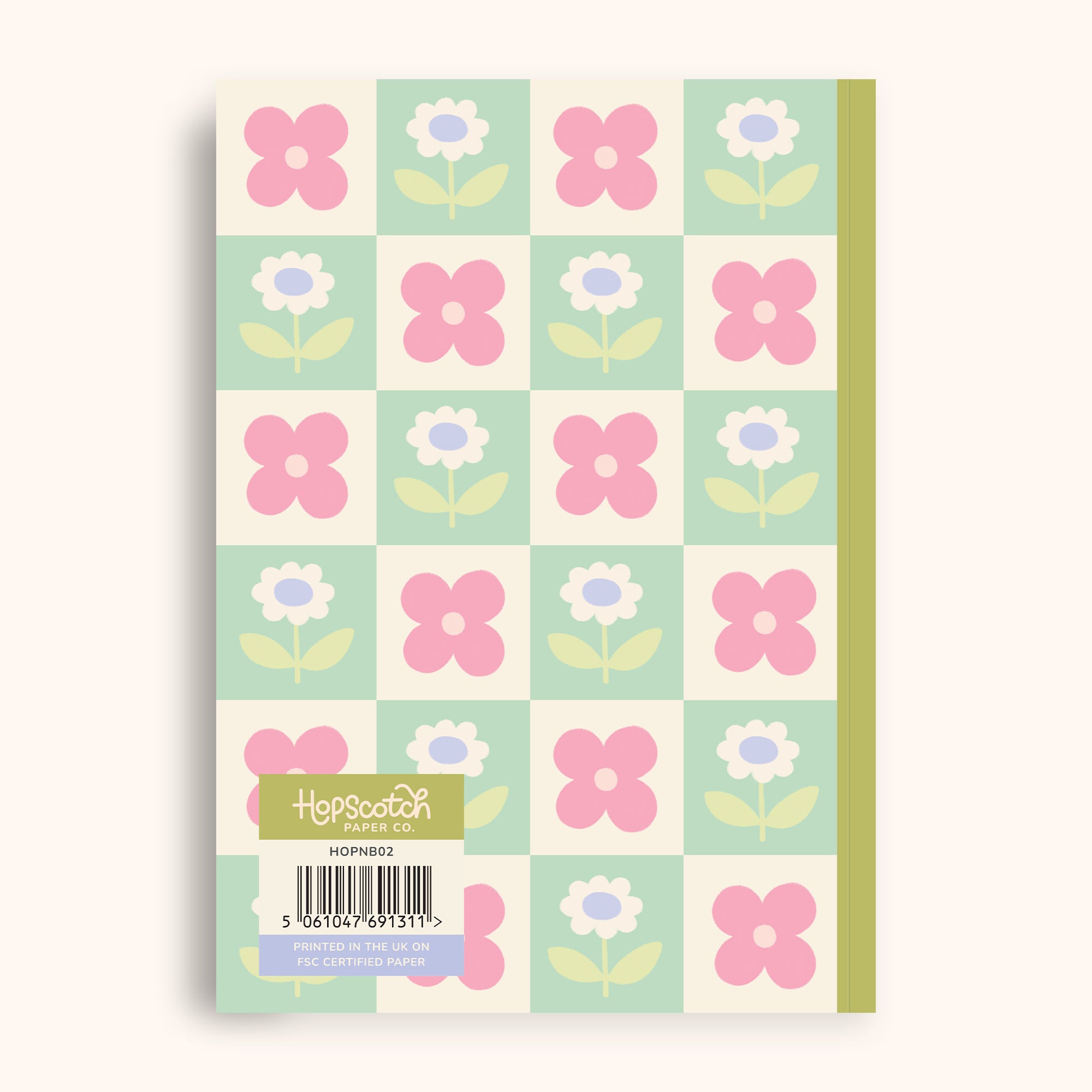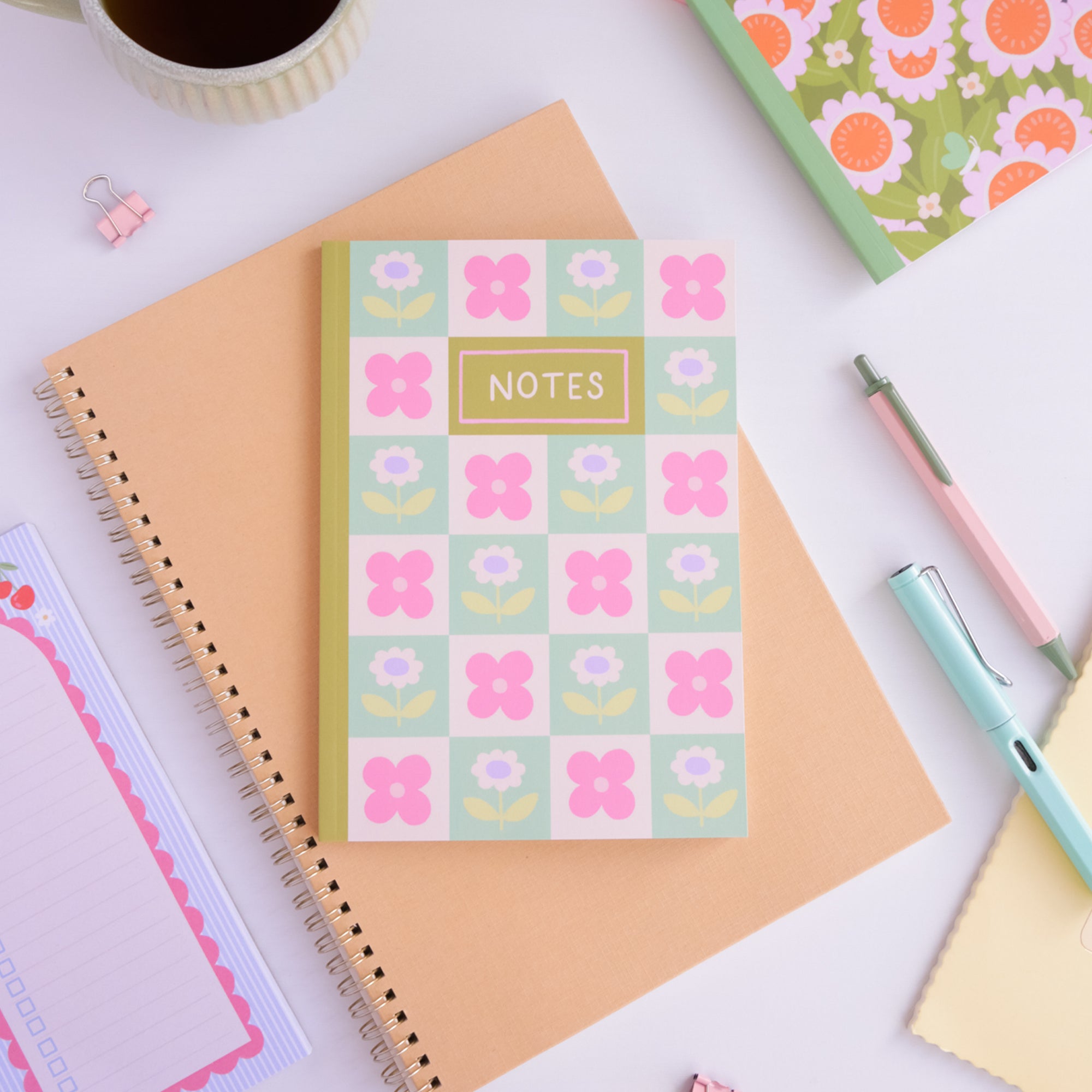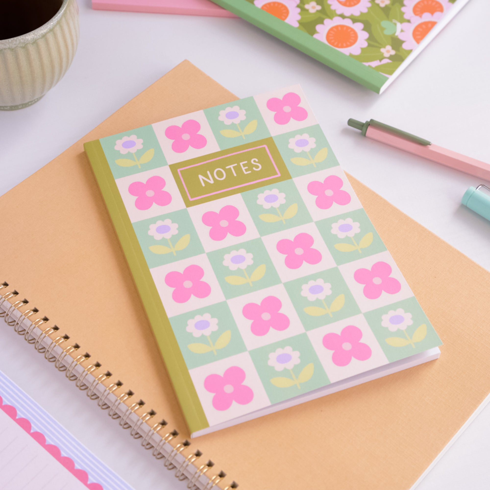 Brighten up your desk with this playful Floral Notebook! Featuring a pastel pattern of pink and white flowers with a green spine, this notebook is as fun as it is functional.