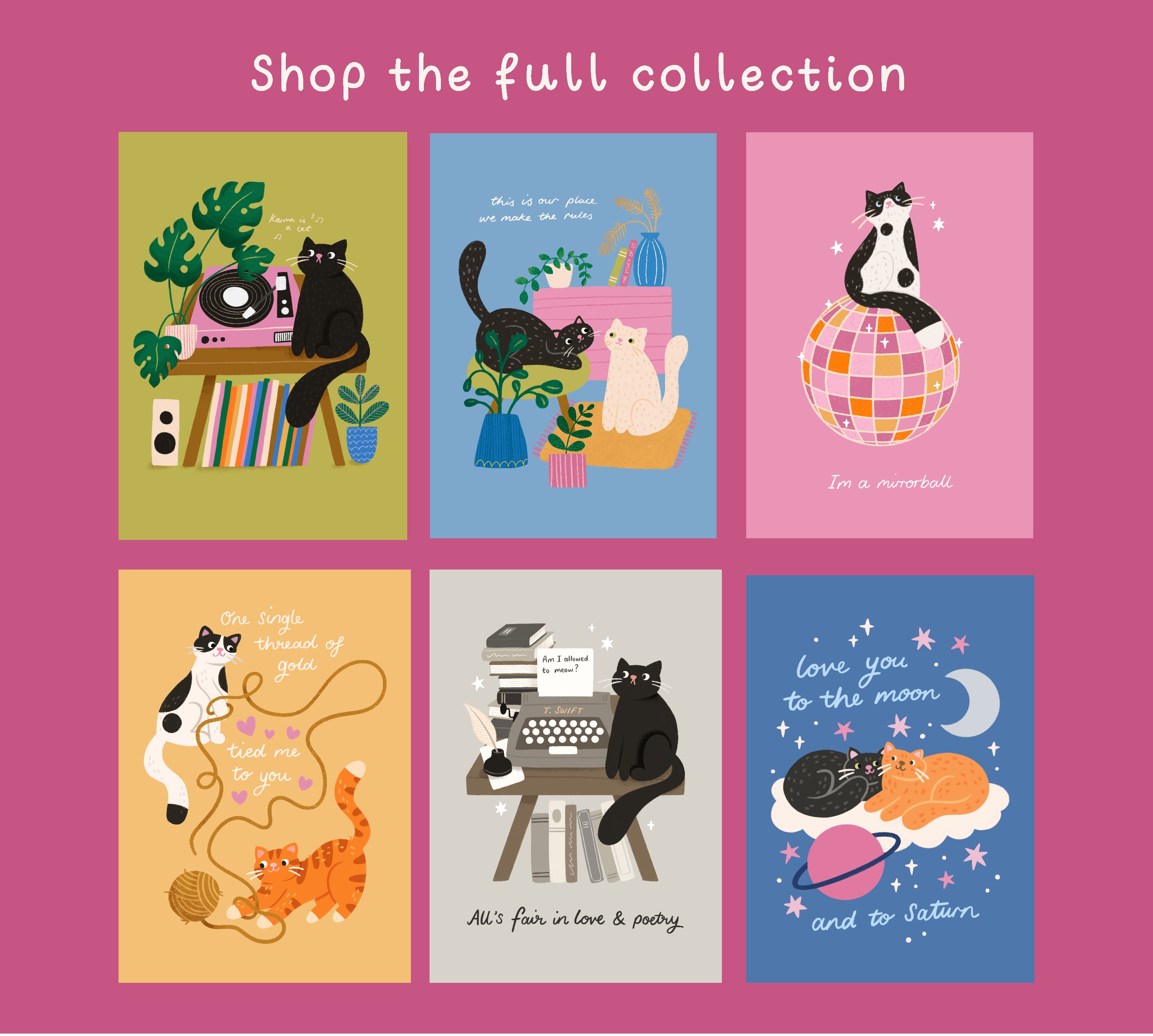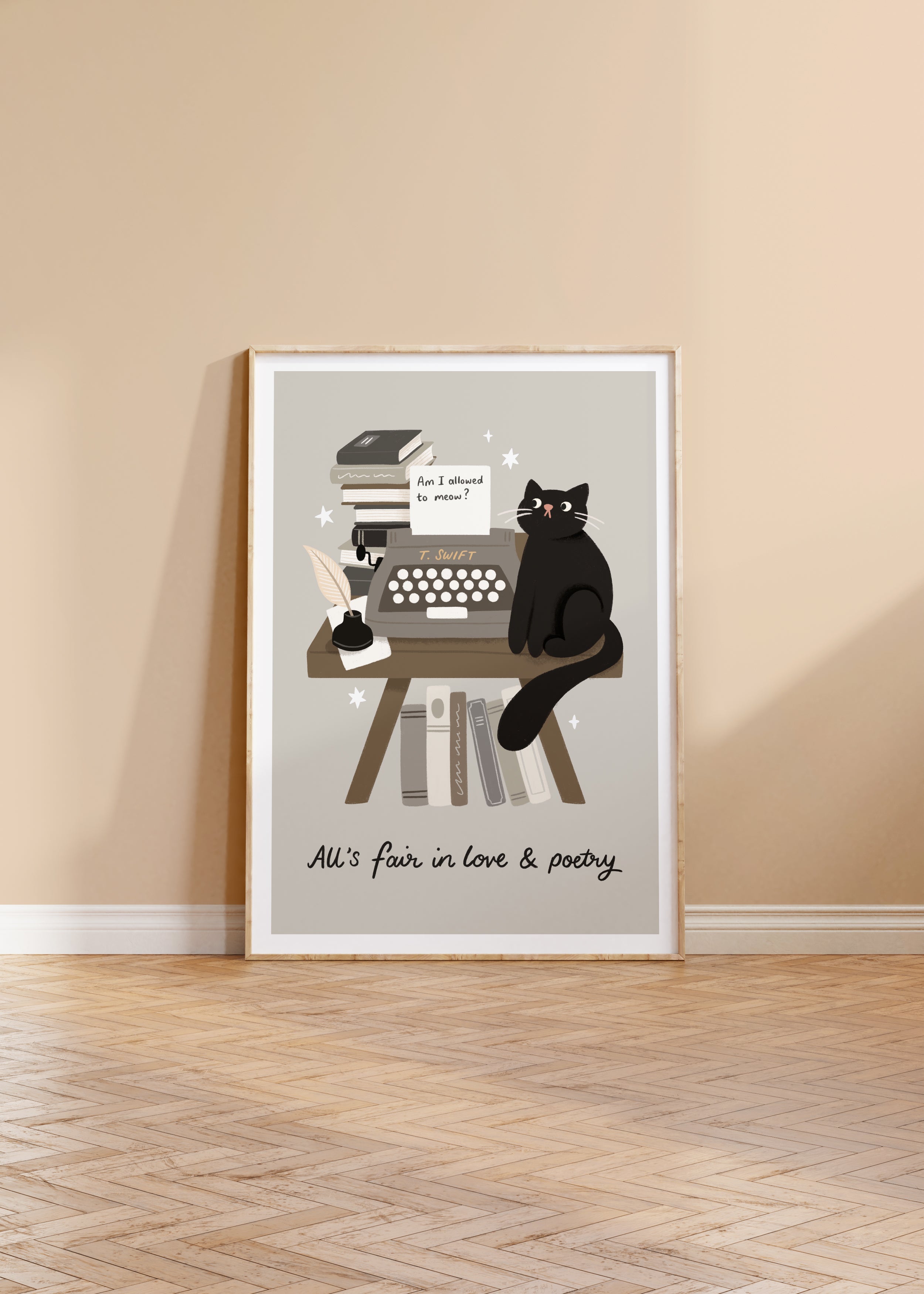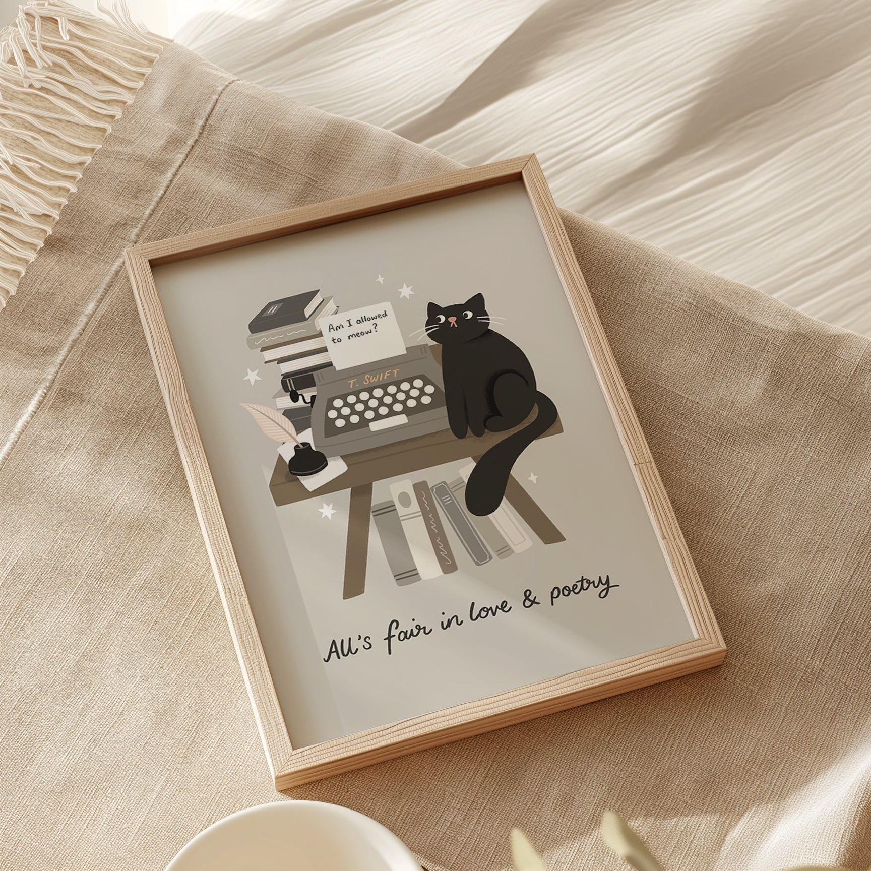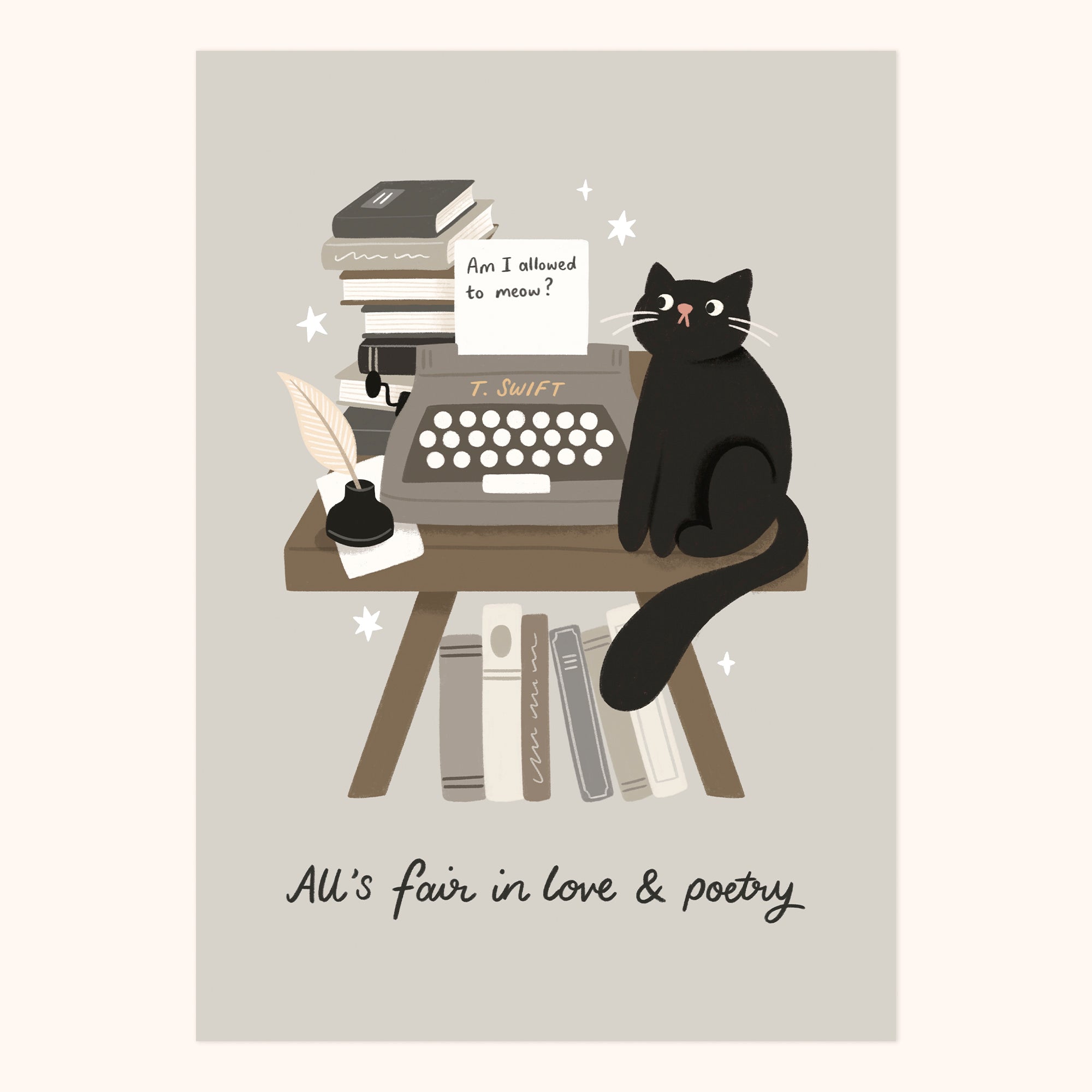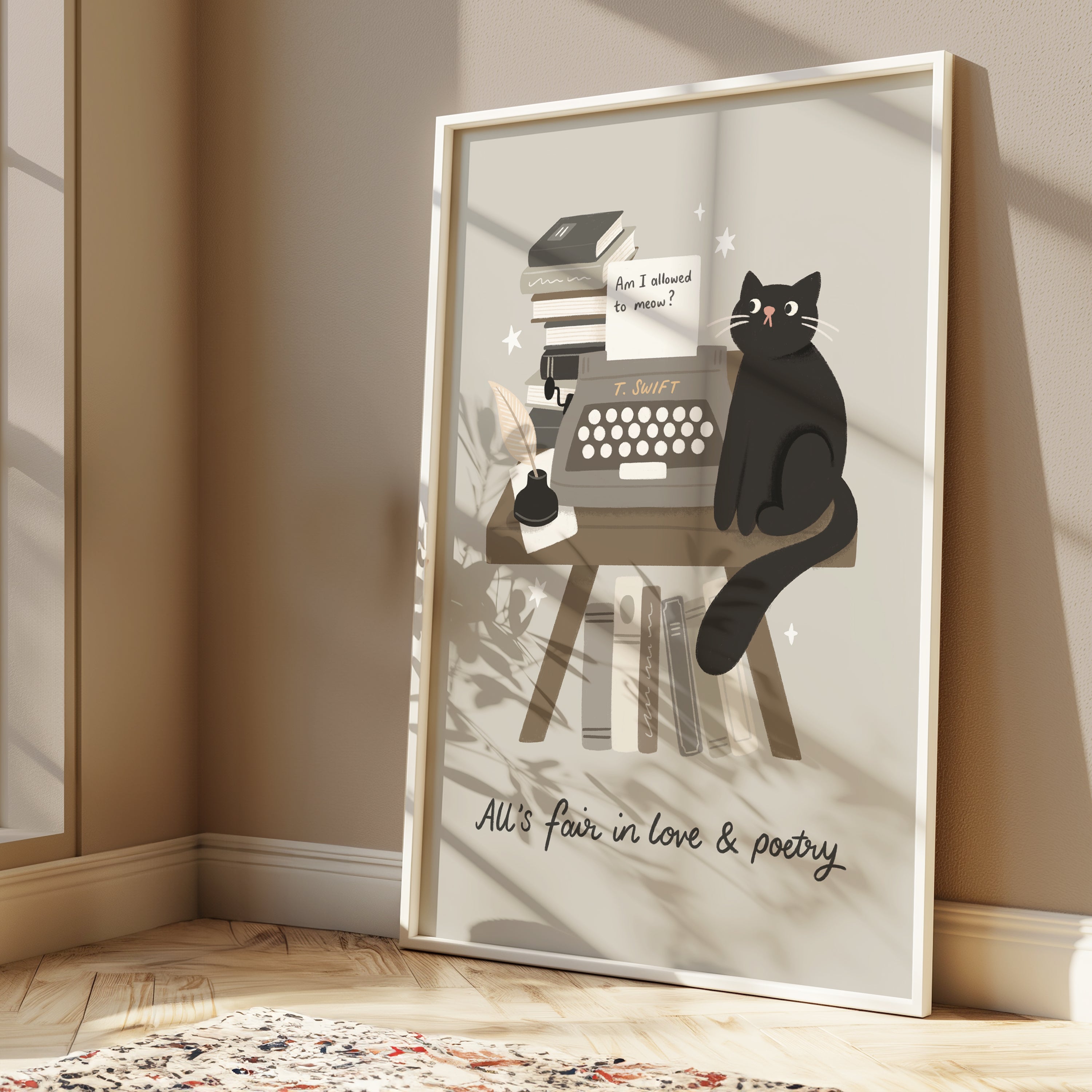 A high quality art print of a cute cat inspired by Taylor Swift's newest album The Tortured Poets Department! The perfect gift for a cat loving Swiftie or a little treat for your own wall.