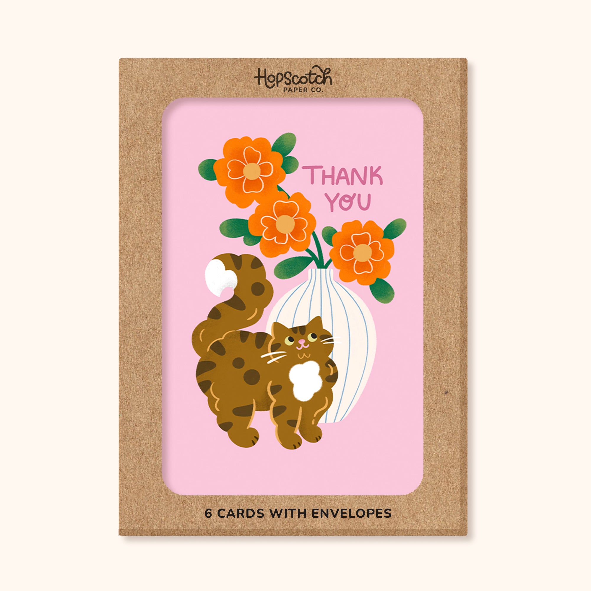 Pack of 6 cat themed thank you cards. Say thank you in style with this lovely pack of thank you cards. Featuring a fluffy brown cat and a vase of bright flowers, this delightful design is unique and will help you express heartfelt gratitude.