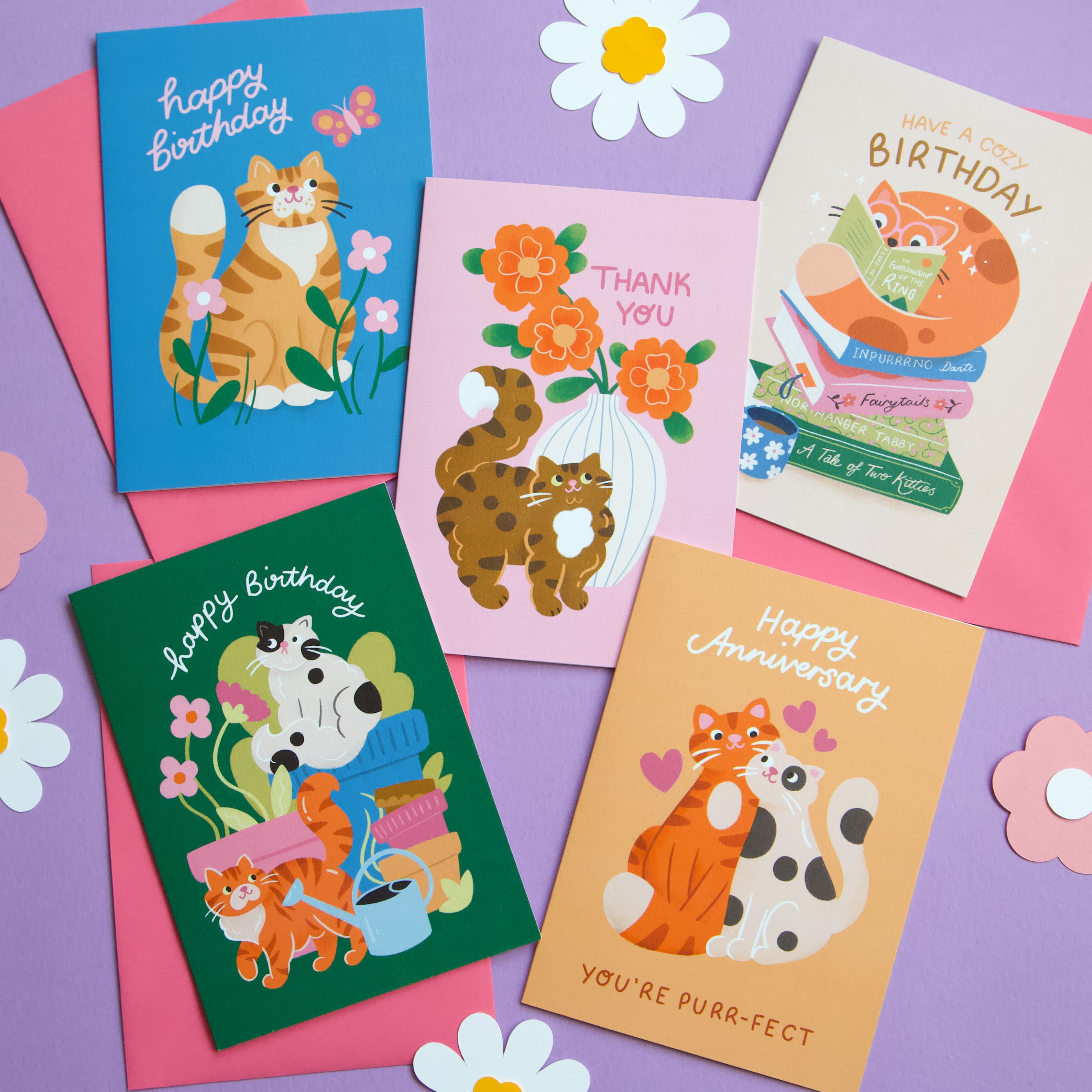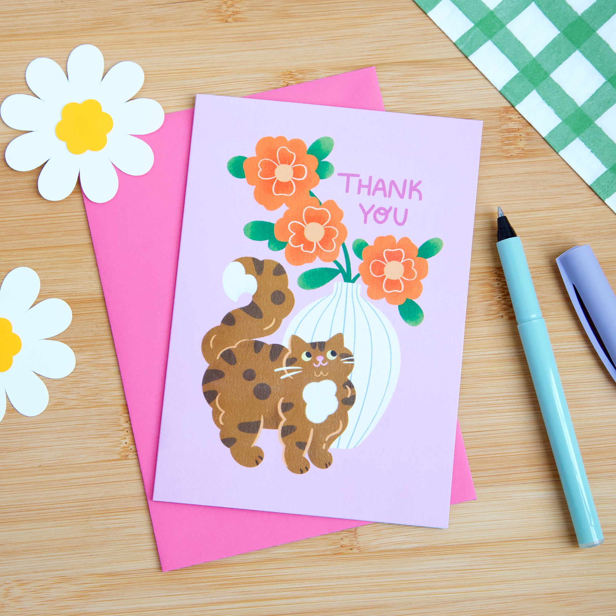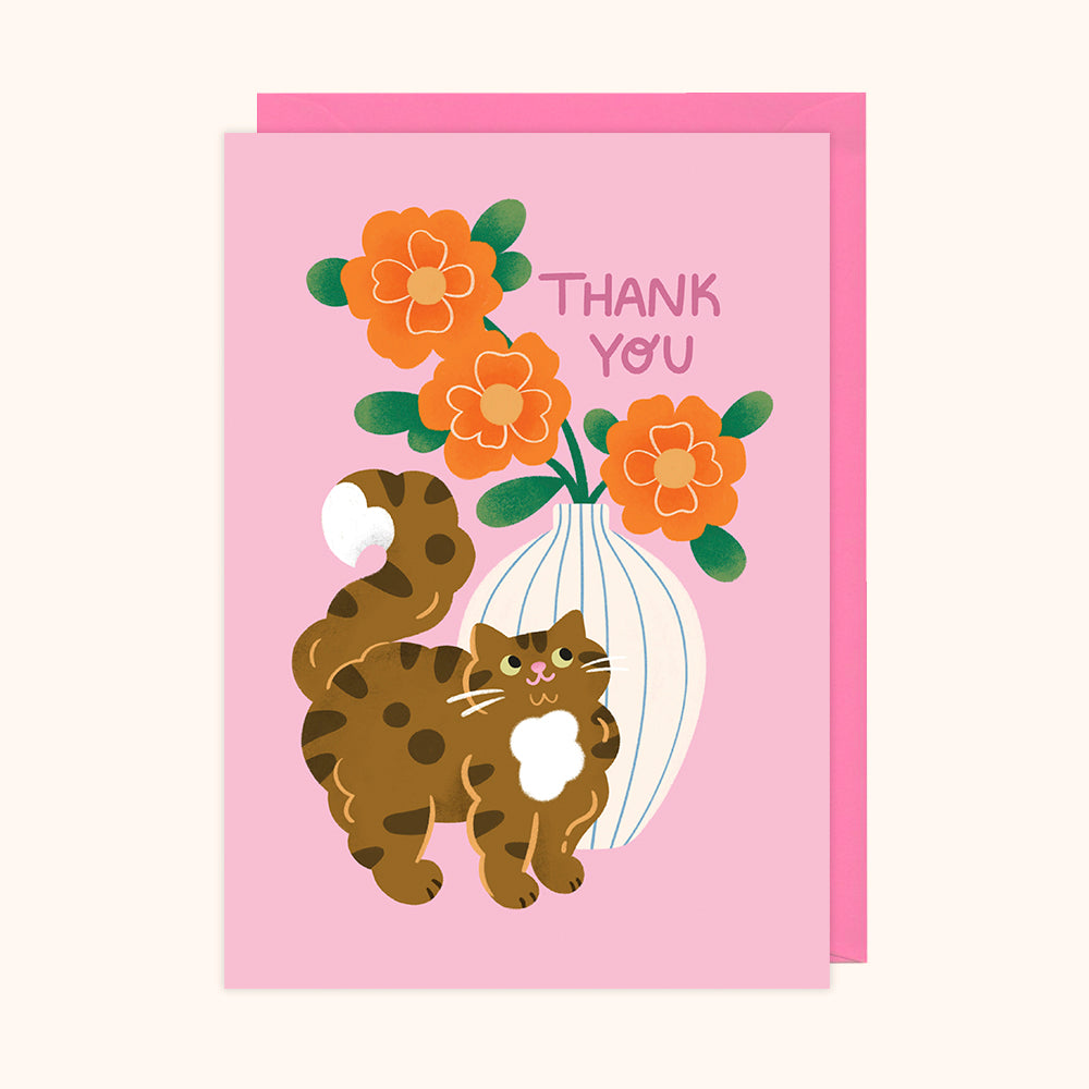 Say thank you with this lovely cat-themed thank you card. This unique card features an illustration of a fluffy tabby cat next to a vase of bright flowers and reads "thank you".