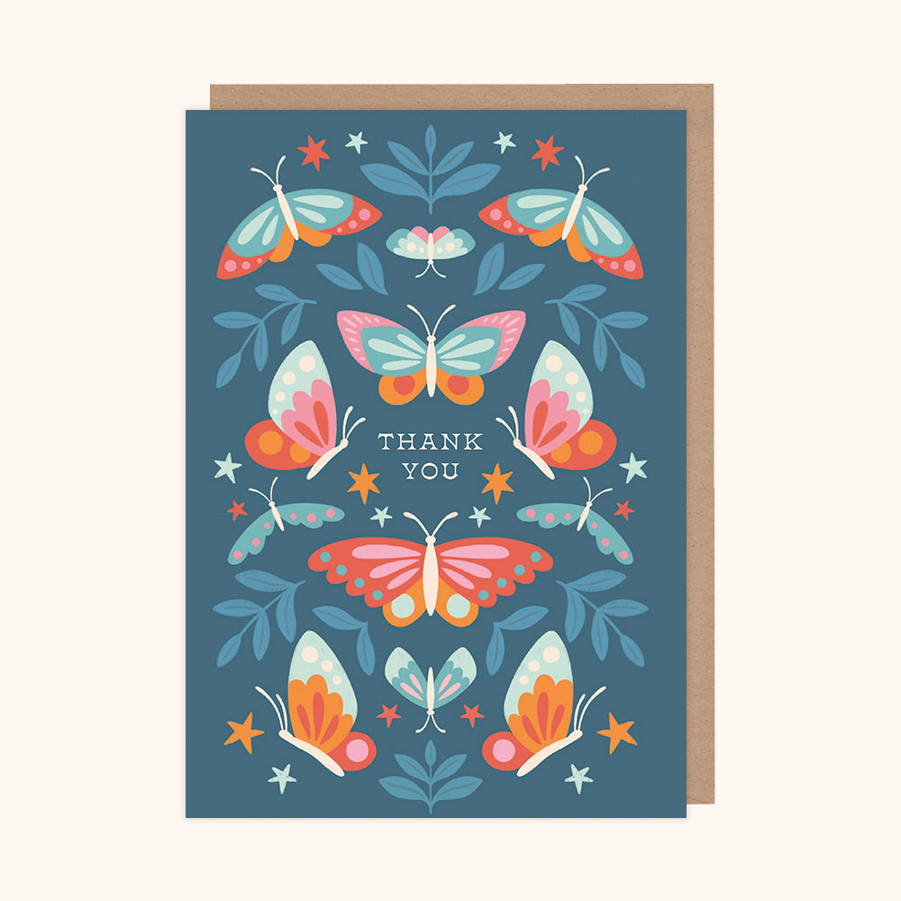 Express your gratitude with this delightful butterfly thank you card. This card features bright butterflies amongst botanicals with the caption "thank you".