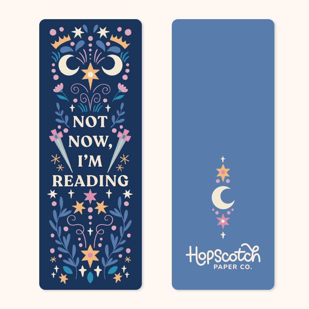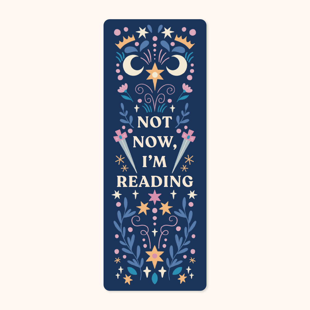 Dive into your favorite worlds with our enchanting "Not Now, I’m Reading" bookmark! Designed for fantasy lovers, this bookmark features captivating imagery of moons, crowns, and swords set against a rich navy blue background. The whimsical quote "Not Now, I’m Reading" serves as a delightful reminder that sometimes, you just need to get lost in a good book.