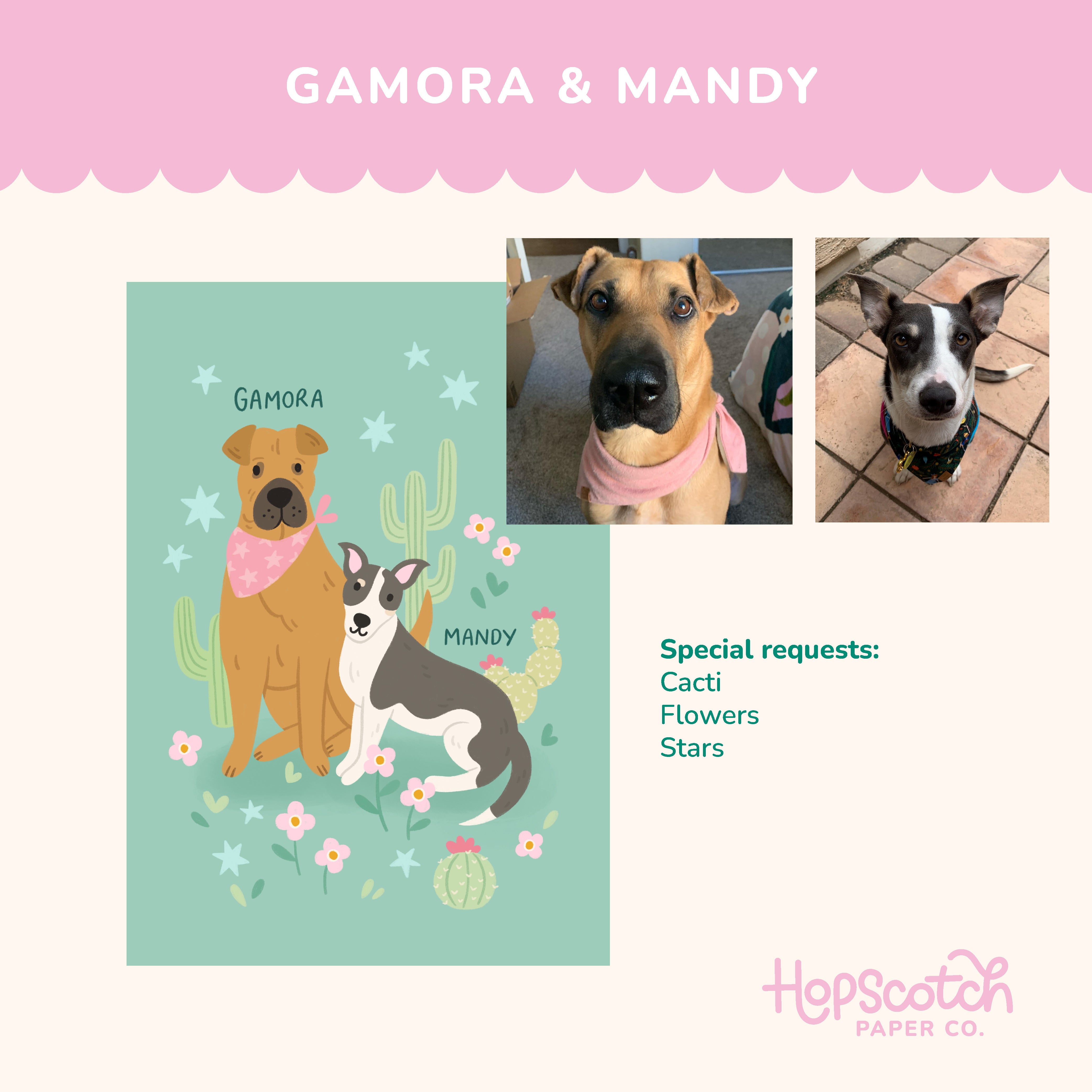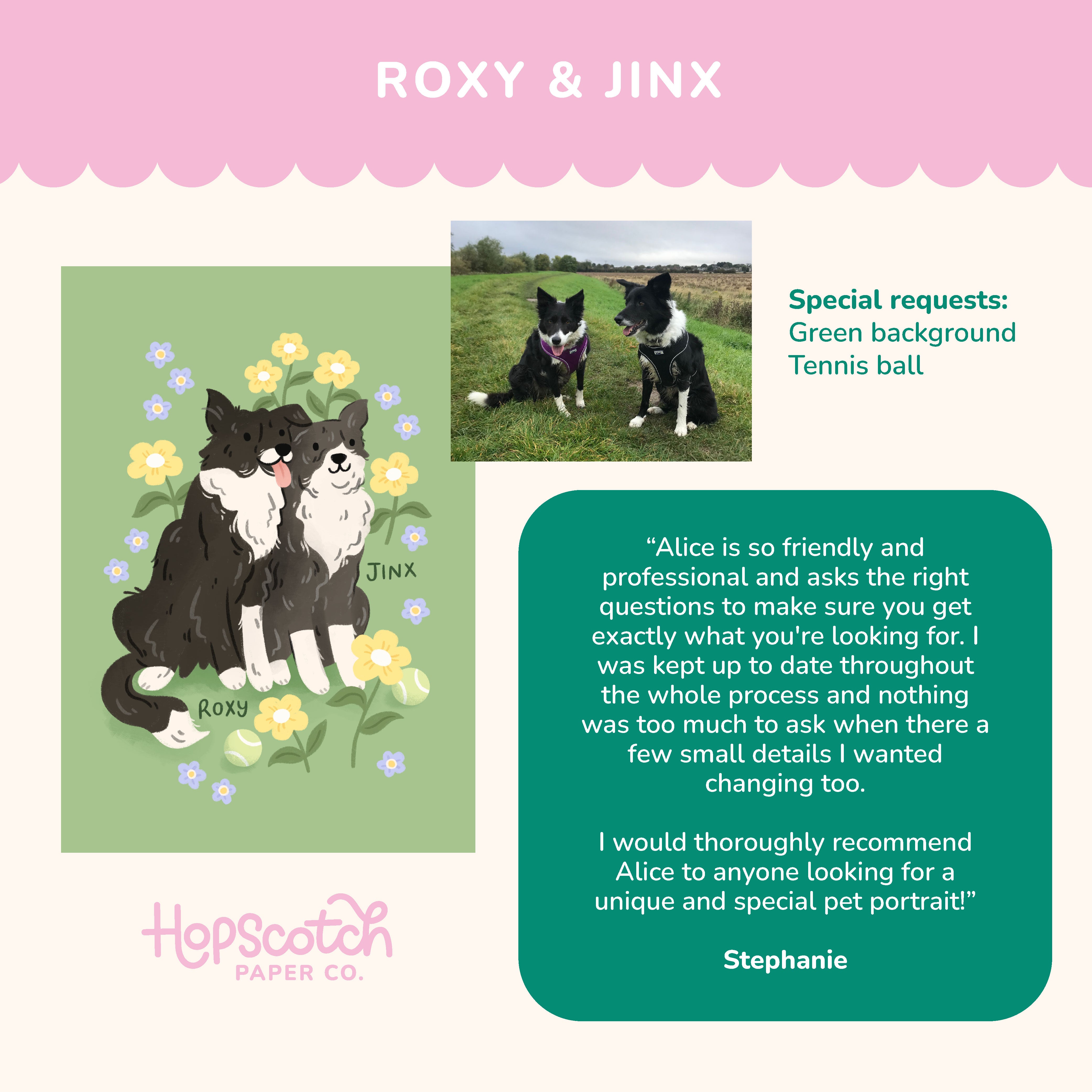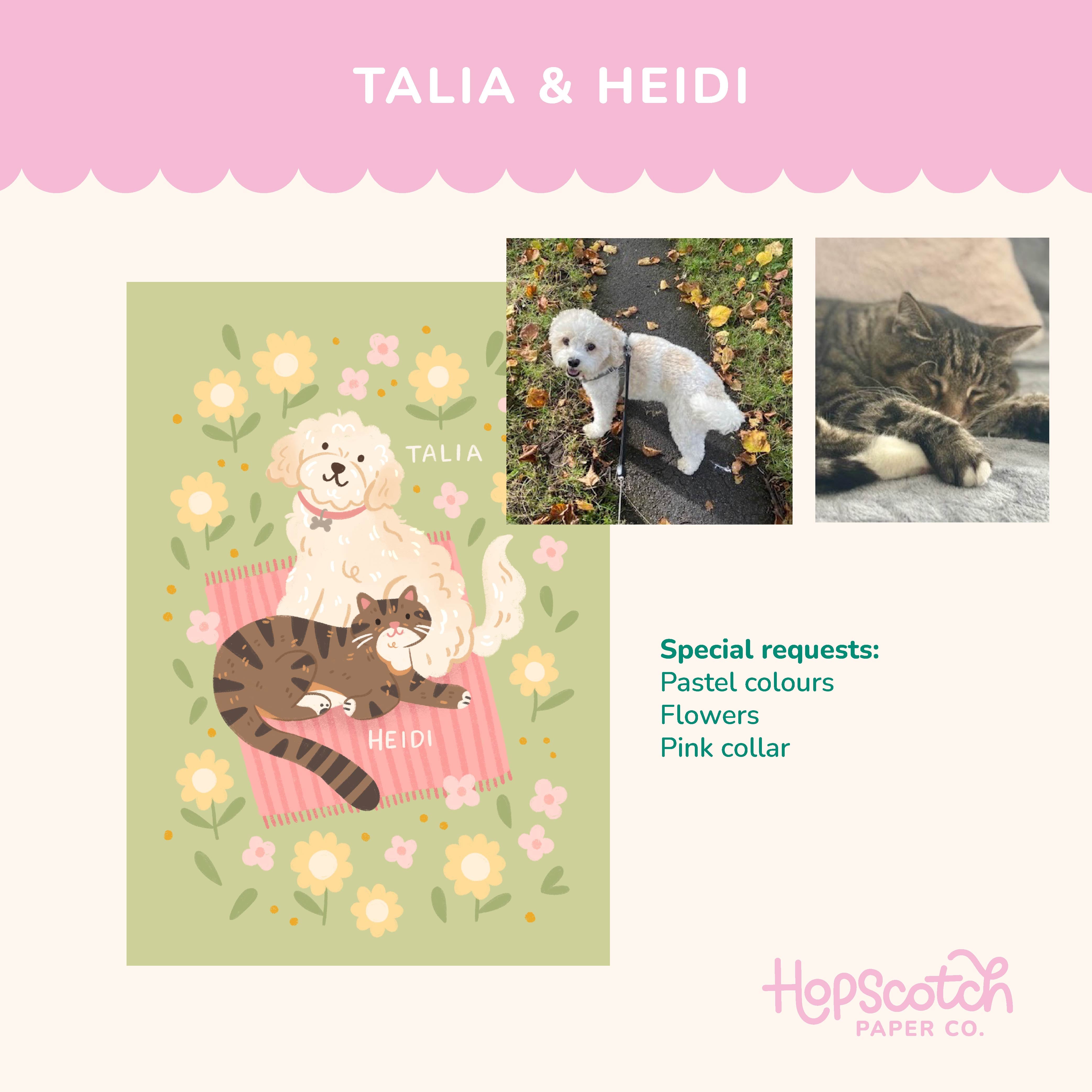 3. Email me at hopscotchpaperco@gmail.com with photos of your pets and a description of their personality. (Also include anything else you'd like me to include on like specific colours, a favourite toy of theirs or their name.)